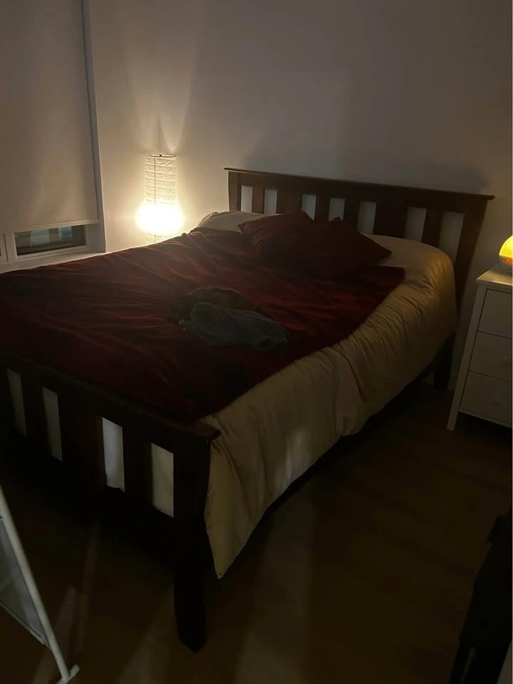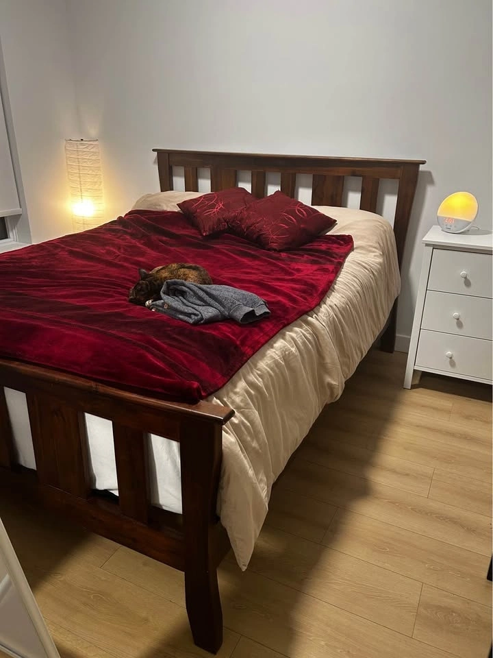 Sturdy, well-built queen bed frame made of solid wood with a rich brown finish. Includes slats and provides lots of under-bed storage space! In great condition with only light wear and a few small surface scratches from normal use.