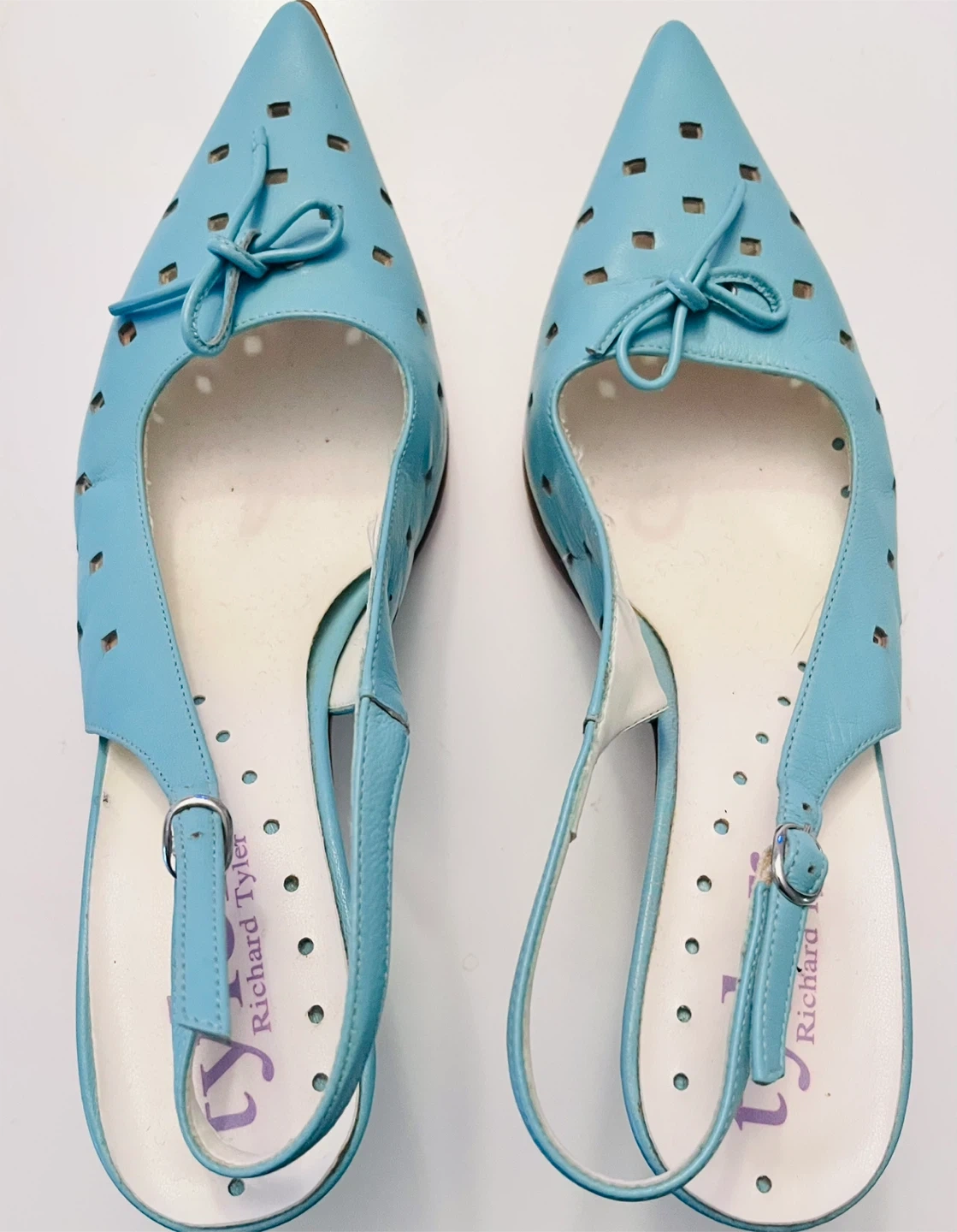 Size 6. These stylish slingback heels from Richard Tyler come in a lovely sky blue colour. They feature a perforated design with a small bow accent. The heel height appears to be around 3 inches.