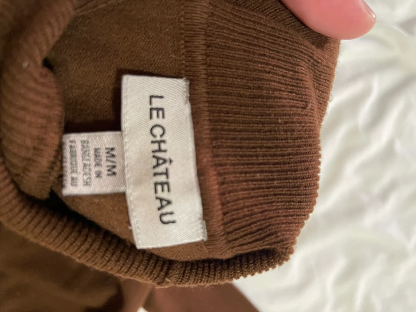 LE CHÂTEAU turtleneck sweater in a rich brown colour. It's a size medium. Made in Bangladesh. Cozy knit perfect for cooler weather!