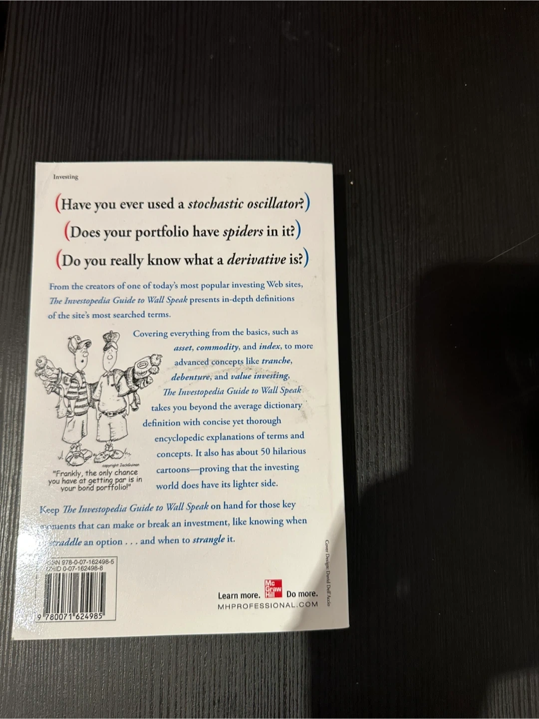 Selling The Investopedia Guide to Wall Speak, edited by Jack Guinan. It's a helpful guide to understanding investing terms and concepts. From the creators of Investopedia's popular investing website, this book presents in-depth definitions of the site's most searched terms. This book covers everything from the basics, such as asset, commodity, and index, to more advanced concepts like tranche, debenture, and value investing