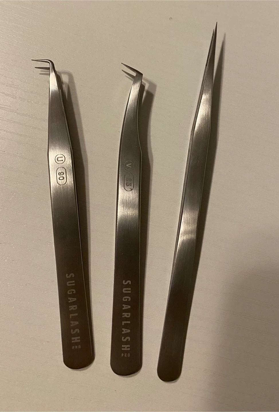Set of three SUGARLASH eyelash extension tweezers. Includes a straight fine-tip tweezer, a curved fine-tip tweezer, and a volume tweezer. Stainless steel construction. These are great for precise lash application!