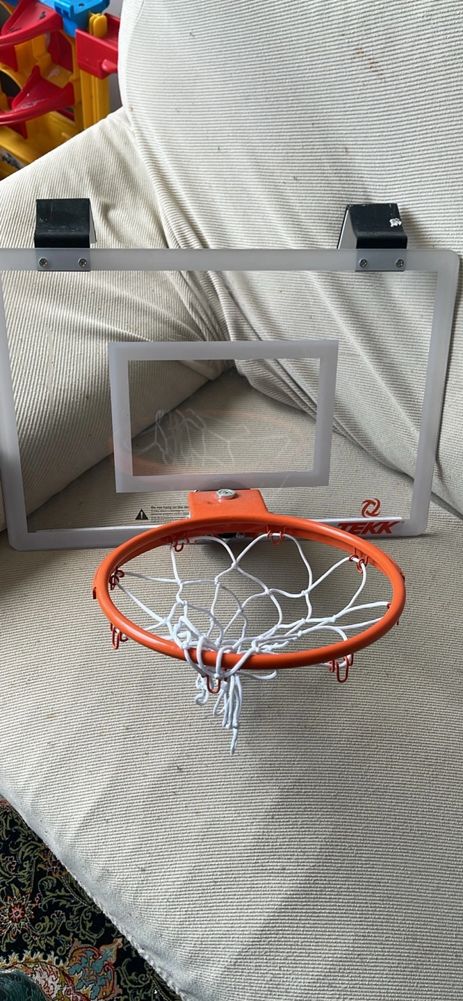 Get ready to shoot some hoops indoors with this Spalding over-the-door mini basketball hoop! It's in great shape and perfect for some fun in your room or office. Easy to install and provides hours of entertainment for kids and adults alike