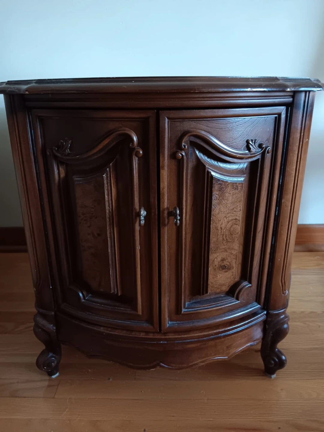This is a charming wooden endtable with intricately carved doors and decorative detailing. It features a rich, dark wood finish and elegant cabriole legs. Two doors open to reveal storage space inside.