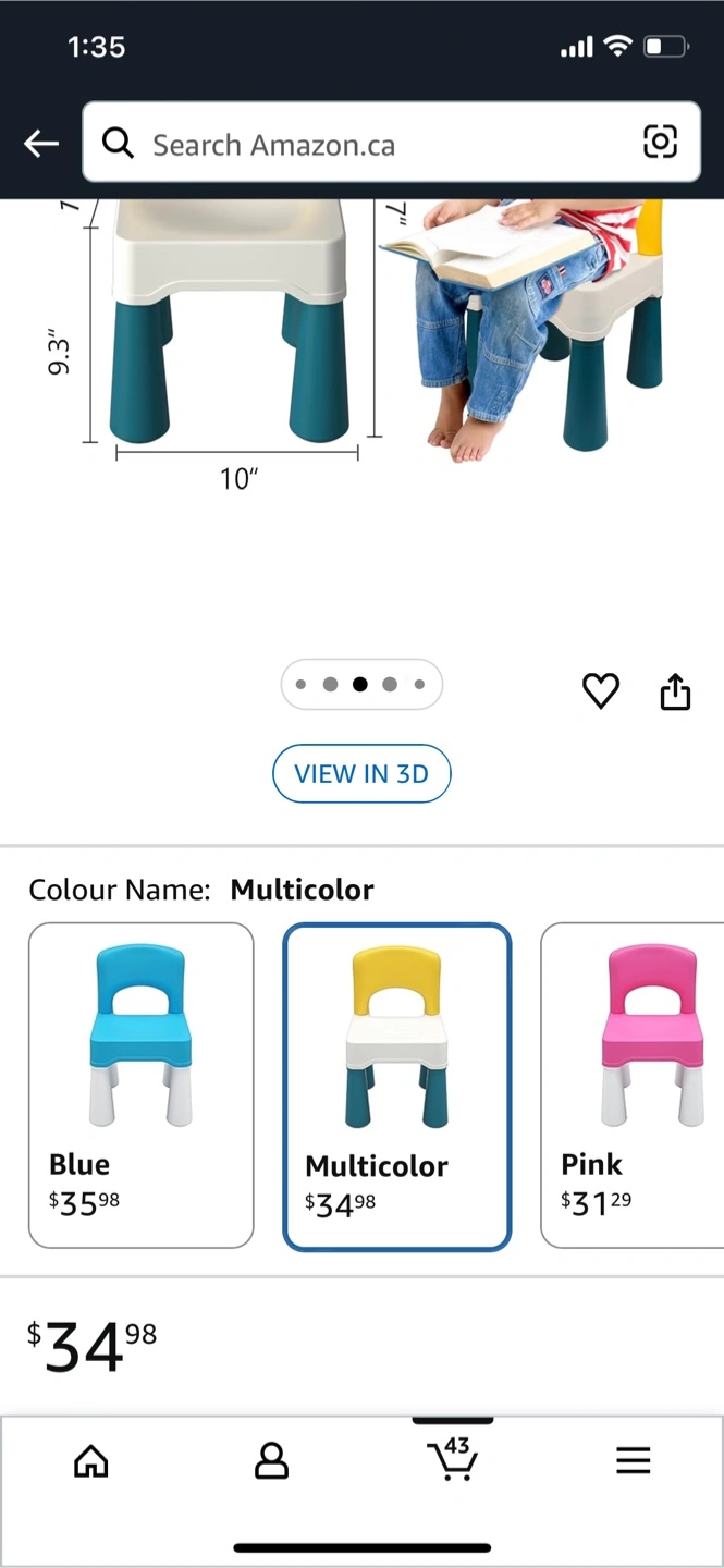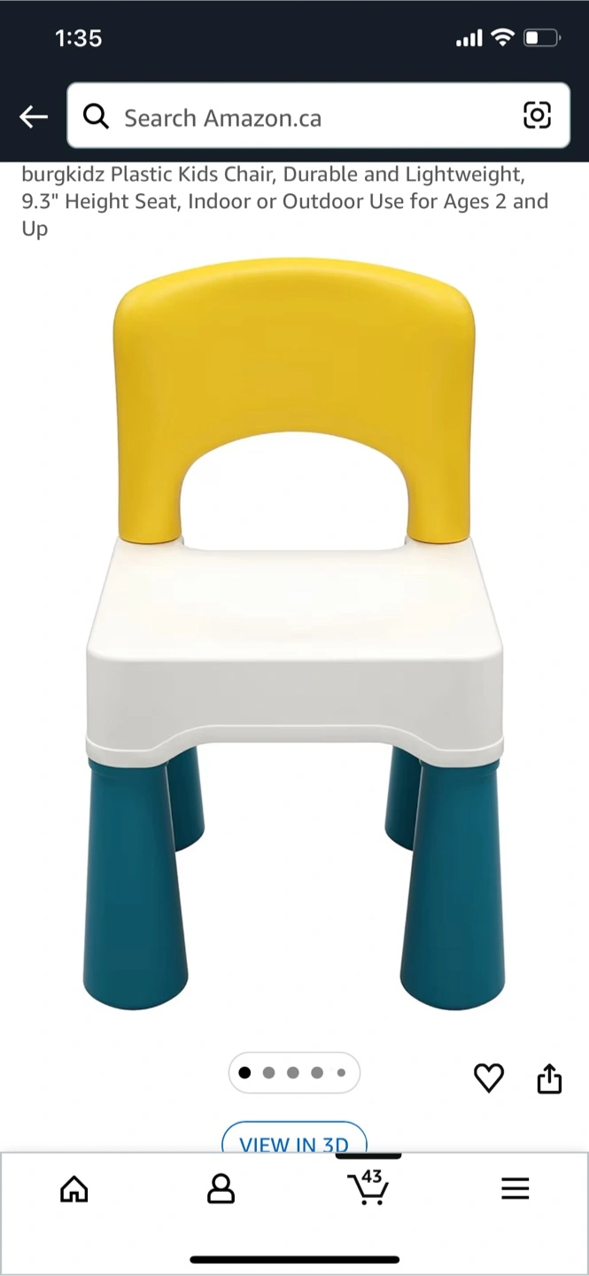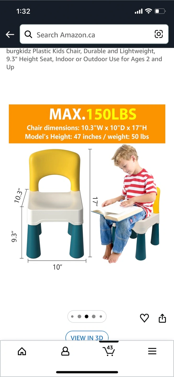 This is a multicolor plastic kids chair. It's durable and lightweight. Chair dimensions are 10.3"W x 10"D x 17"H. Model's height is 47 inches, and weight is 50 lbs. Maximum weight capacity is 150 lbs. Suitable for ages 2 and up.
