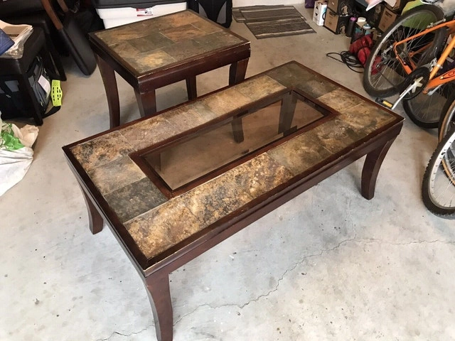 Heavy duty coffee table with tiles and a mirror top. Glass has a chip in one corner. Originally purchased for around $1000 USD. For Sale By Owner. Curbside pickup only. Cashless payment accepted.