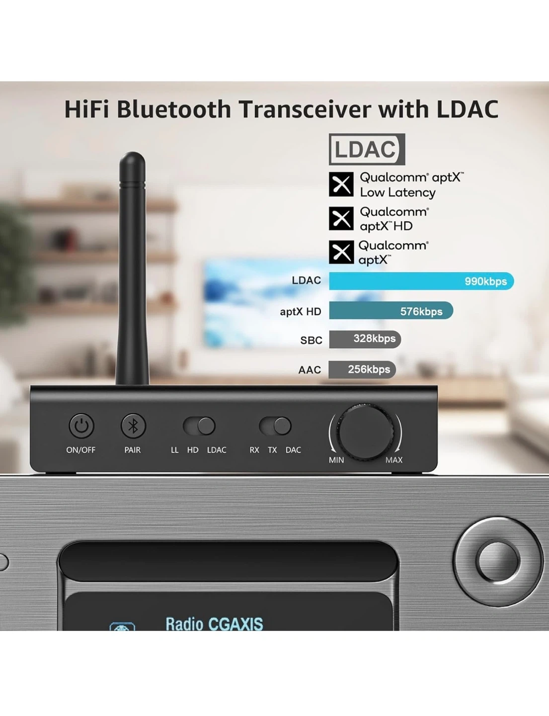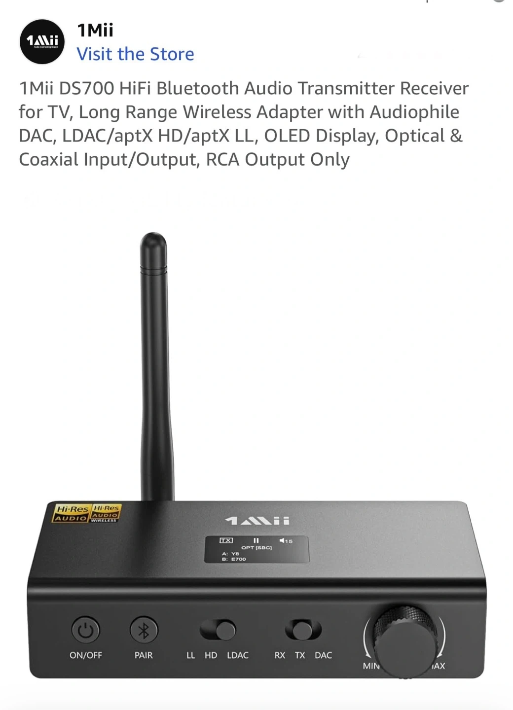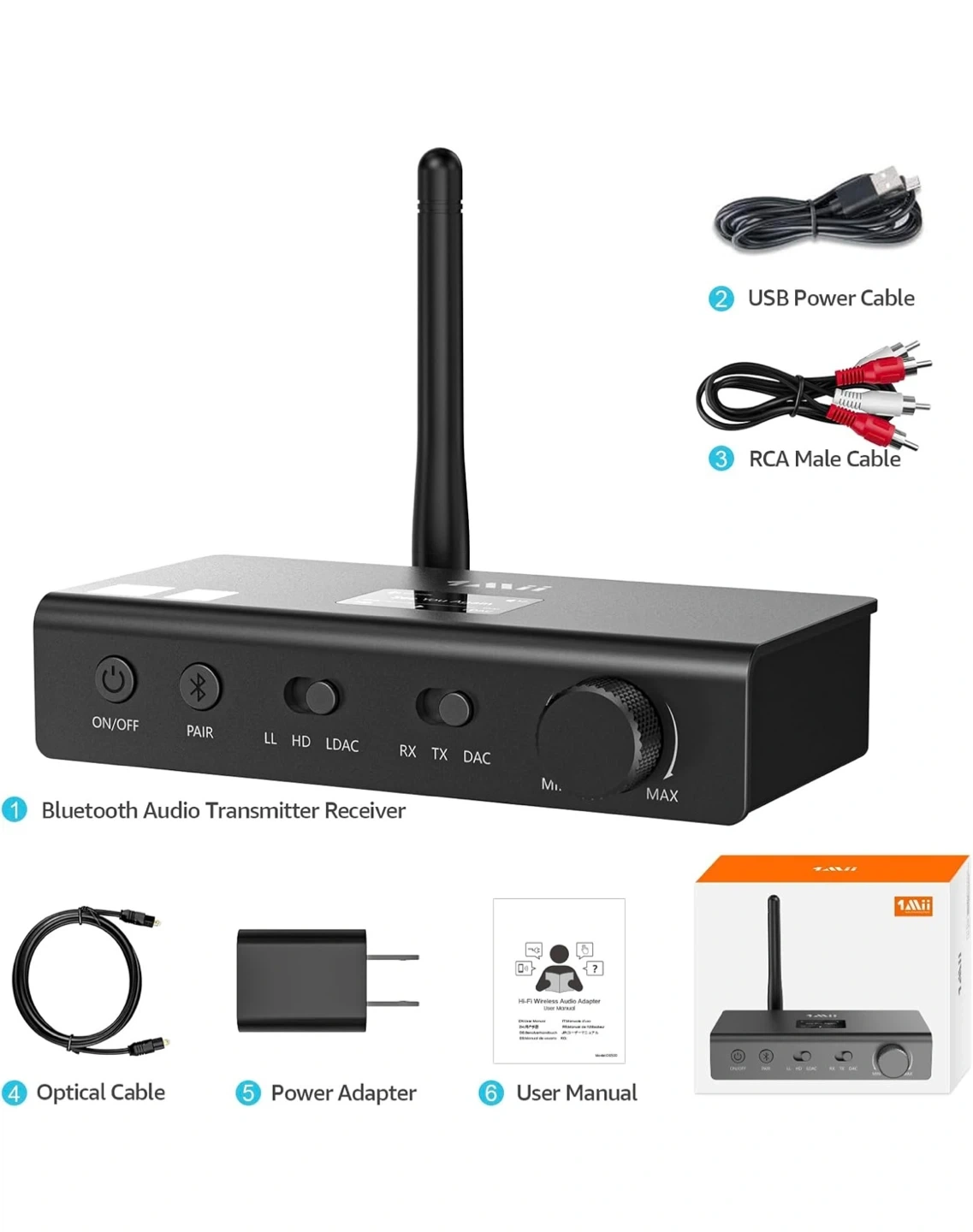 Selling a 1Mii DS700 HiFi Bluetooth Audio Transmitter Receiver. This device is perfect for TV, offering a long-range wireless adapter with Audiophile DAC, LDAC/aptX HD/aptX LL, OLED Display, Optical & Coaxial Input/Output, and RCA Output. It comes with a USB power cable, RCA male cable, optical cable, power adapter, and user manual.