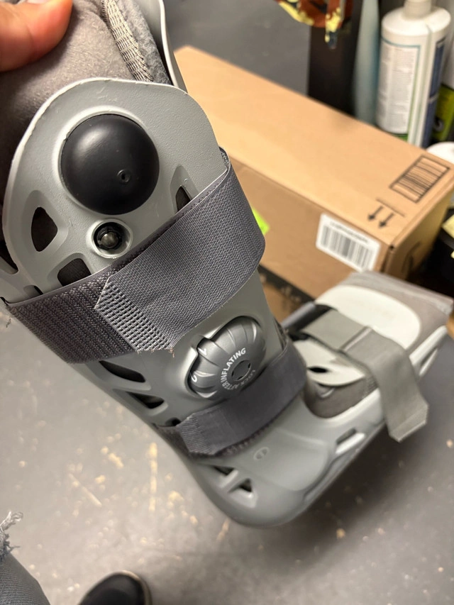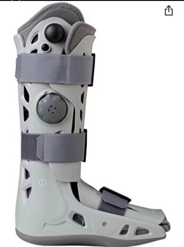 Aircast Boot (Long) I have a brand-name Long Aircast boot in size Medium. Check the photos for sizing details. I bought it from the hospital for $180 and used it mostly for protection, barely walking and leg always in a sock/stocking during use. As you can see in all the photos but especially the photo of the bottom, it’s used but in very reasonable condition. I will also include a roll of cut-to-size stockings.