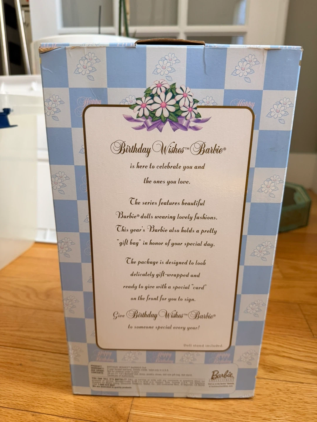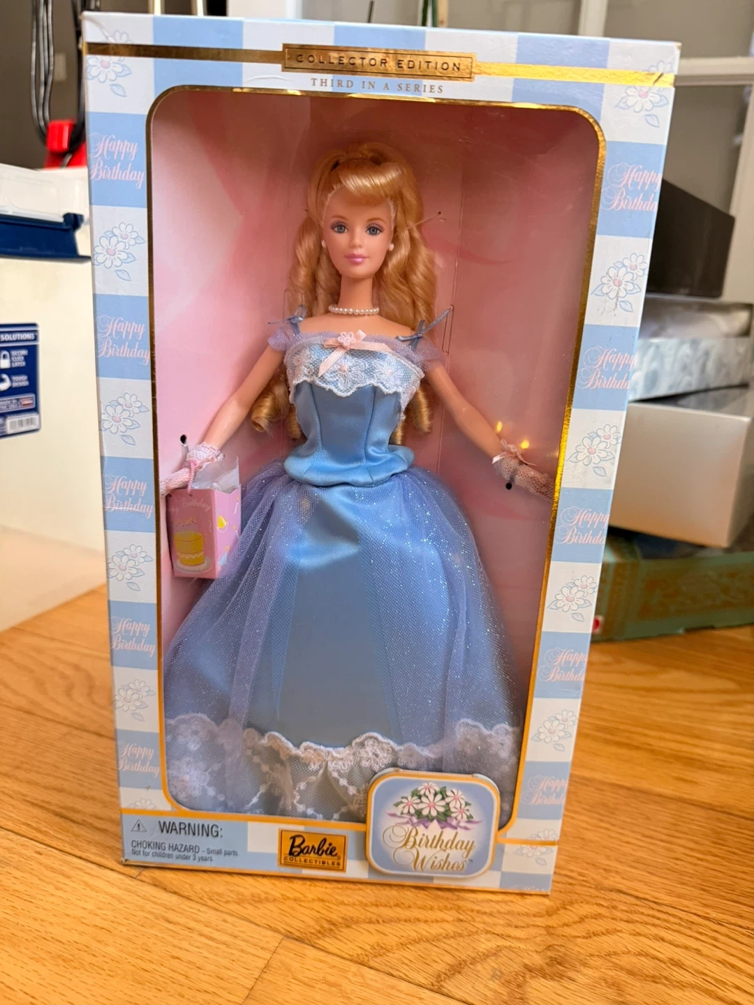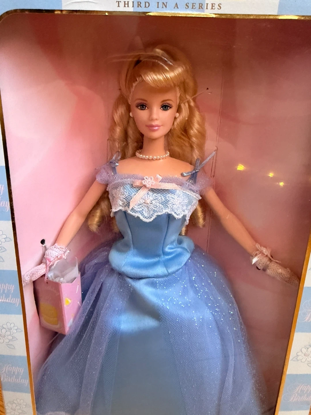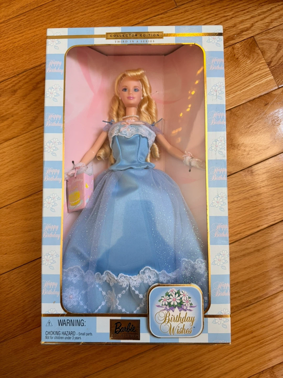 Beautiful Birthday Wishes Barbie from the Collector Edition series (Third in Series). This elegant doll features a soft blue satin gown with lace detailing, delicate gloves, a pearl necklace, and a birthday gift bag accessory. • Collector Edition – Third in Series • Original box included (NRFB – never removed from box) • Includes accessories (gift bag + doll stand) • Box shows some shelf wear/creasing (see photos) • Doll is in excellent condition This is a perfect giftable collectible — ideal for birthdays, Barbie collectors, or display.
