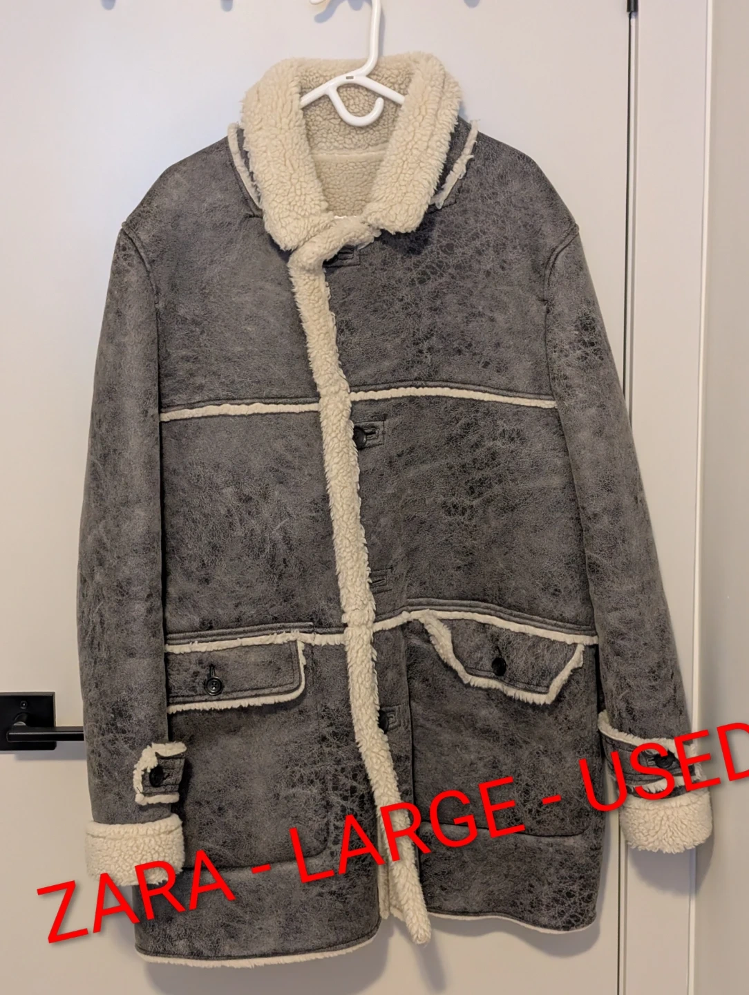Selling a Zara jacket in size large. It's a grey colour with a faux shearling trim. It's in used condition, but still has lots of life left!