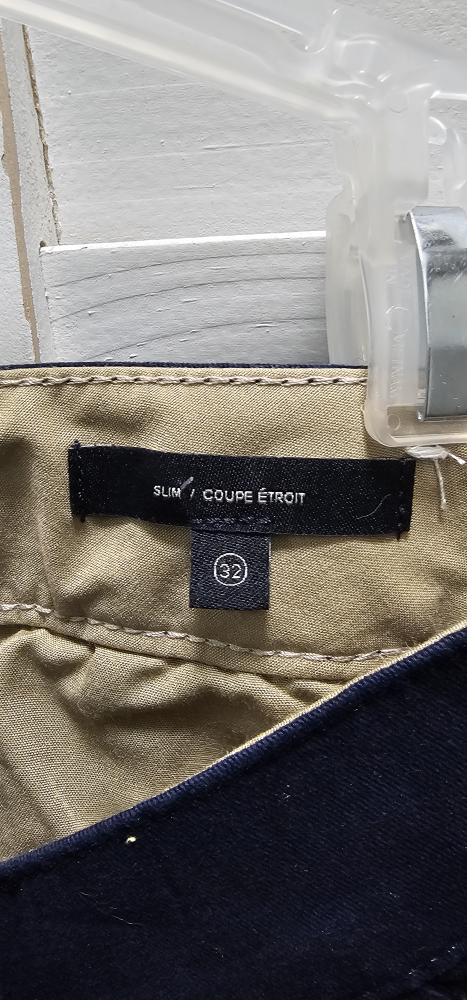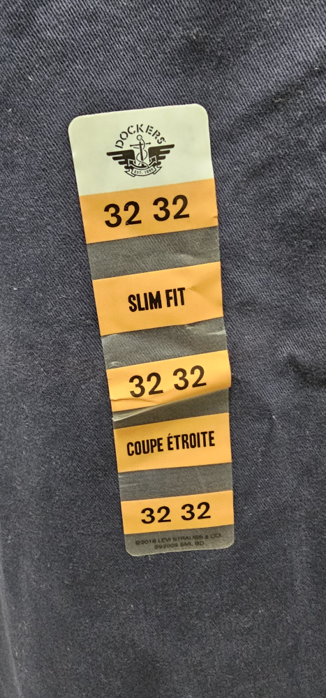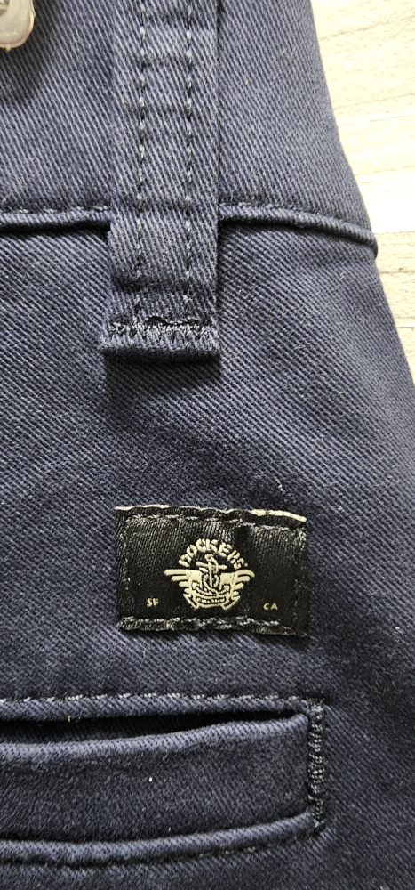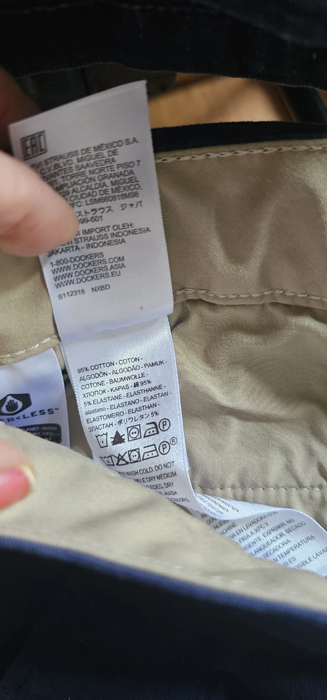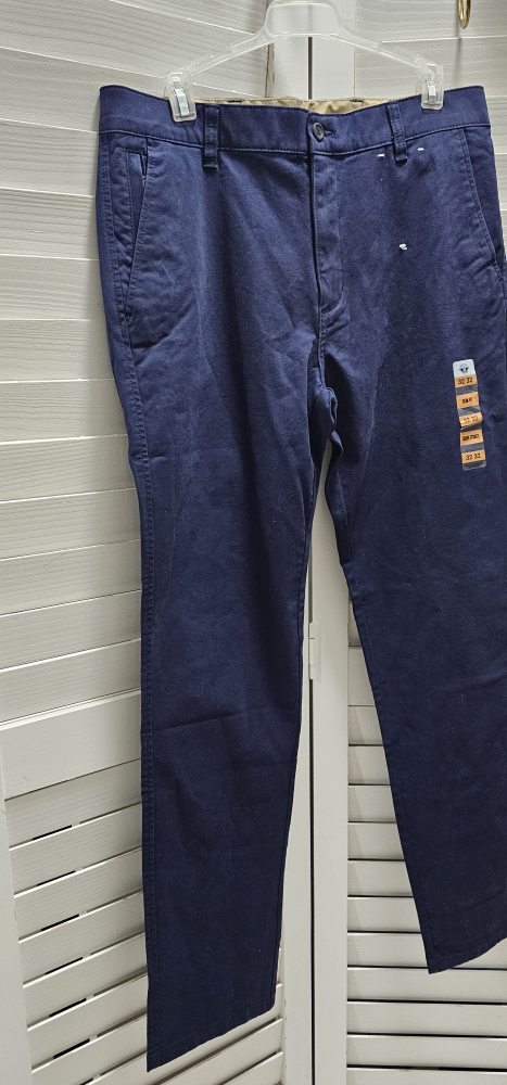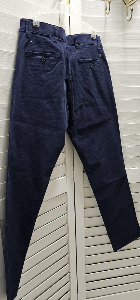 A pair of blue pants. Features a button closure. Back pockets, and front pockets. Slim fit. Dockers logo is visible. These are comfortable to wear while working from home, or relaxing.
