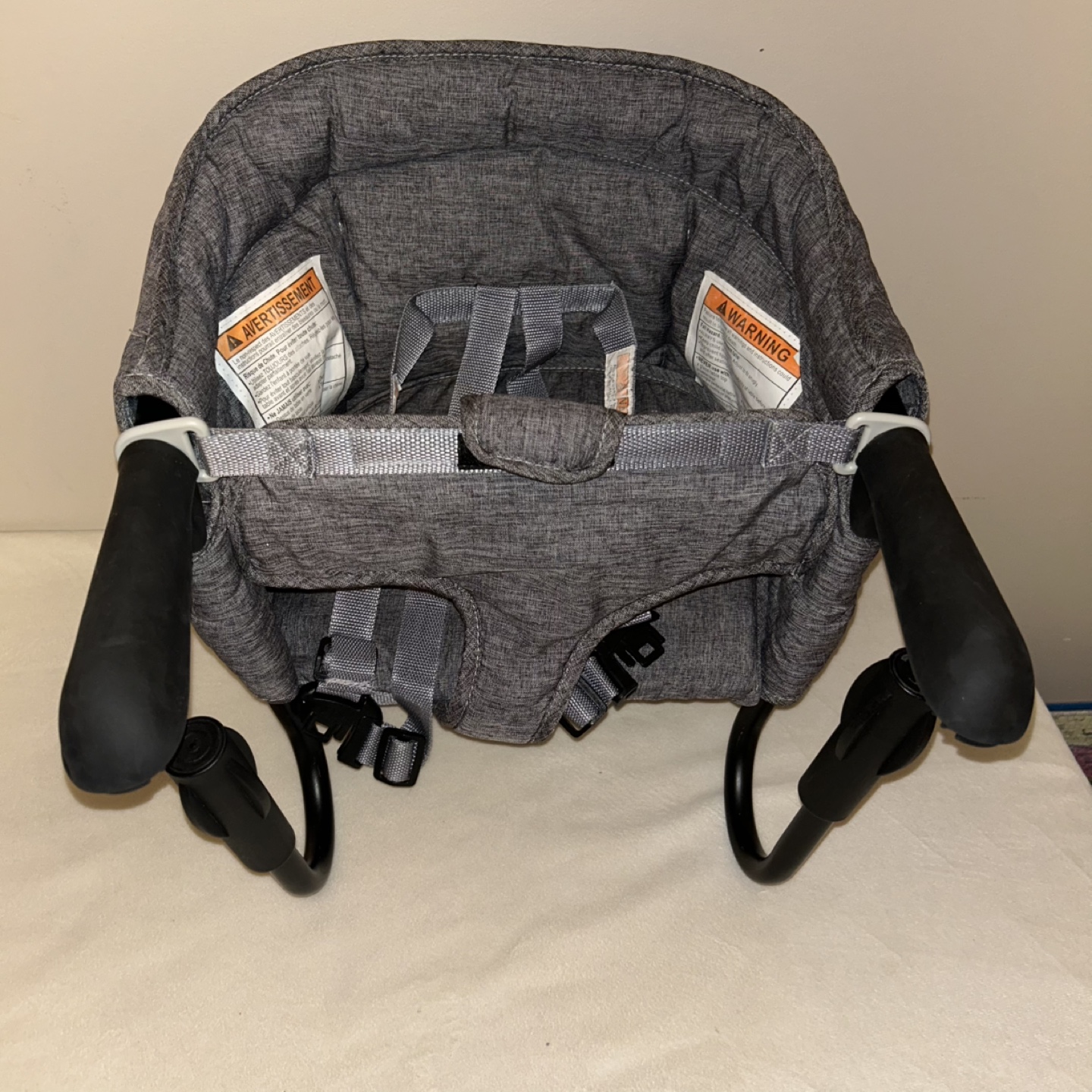This Tcbunny baby booster seat is made from grey textured fabric. It features adjustable straps and a secure harness system. It's designed to attach to table making meal times easier for little ones.
