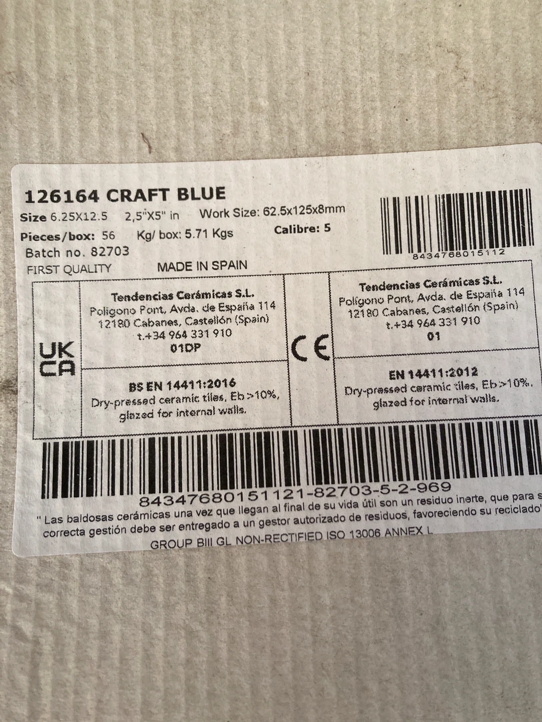 Selling Craft Blue ceramic tiles. There are 56 pieces in the box and 47 in another one. Each tile measures 6.25x12.5 cm (2.5"x5" in). They are dry-pressed ceramic tiles, glazed for internal walls. Subway stile, beautiful, perfect for the small backsplash. Made in Spain.