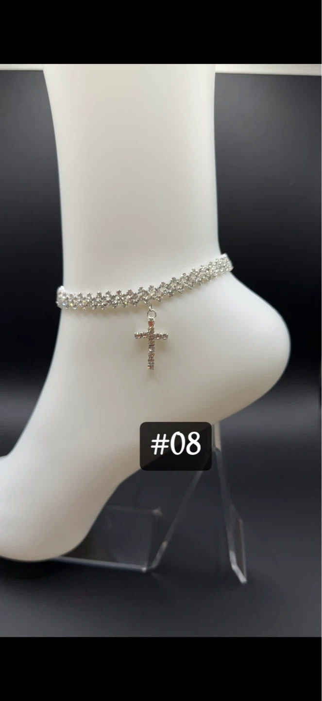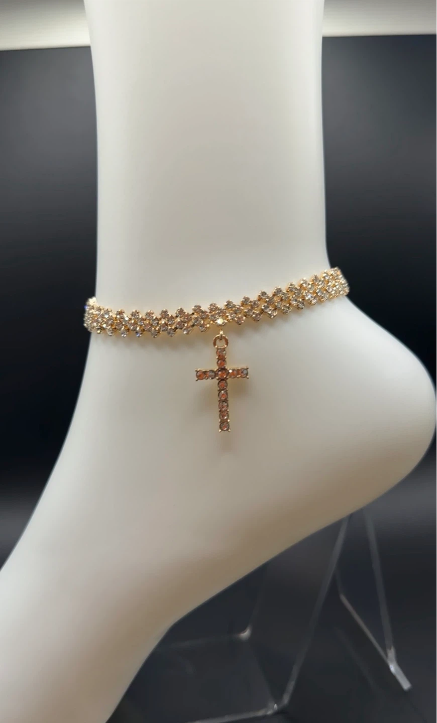 This sparkly anklet features a gold-tone finish and a delicate cross charm adorned with crystals. It's designed with a double row of rhinestones for extra shine. A lovely accessory for any occasion!