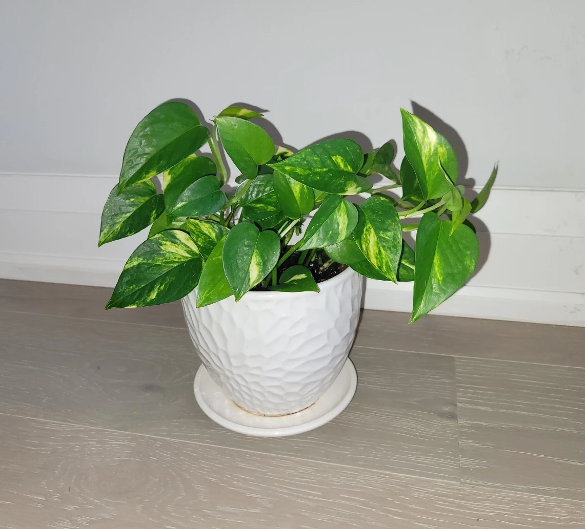 A healthy and easy to grow golden pothos plant in a beautifu white ceramic pot for only $9. Perfect for adding some greenery to your home.