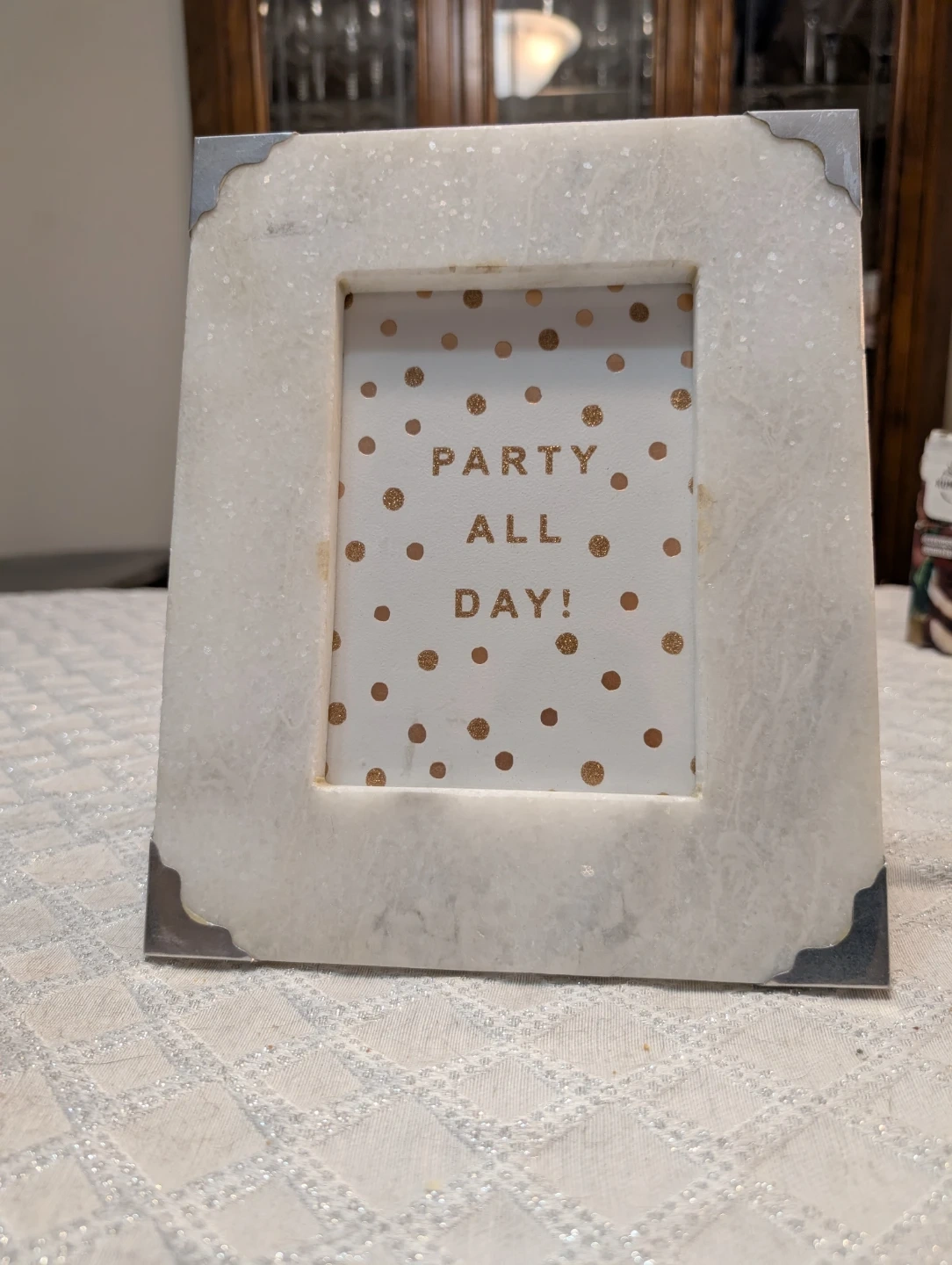 White marble decorative photo frame featuring has silver corner protectors. This frame's unique design makes it a fun accent piece. handcrafted by artisan in India.