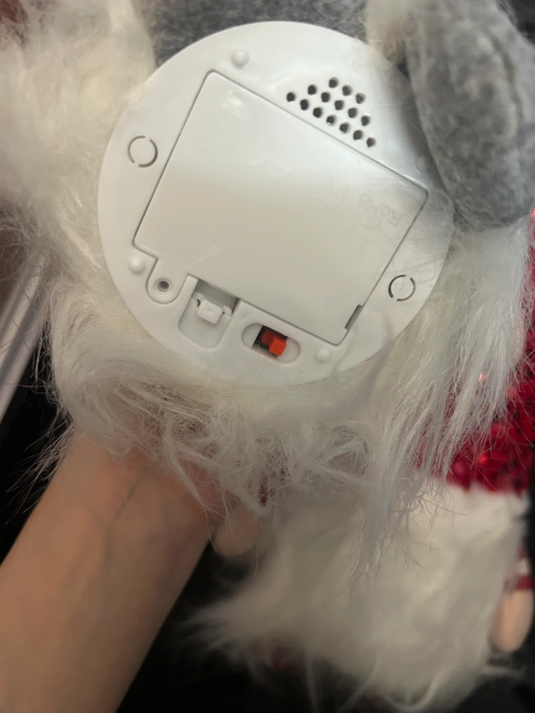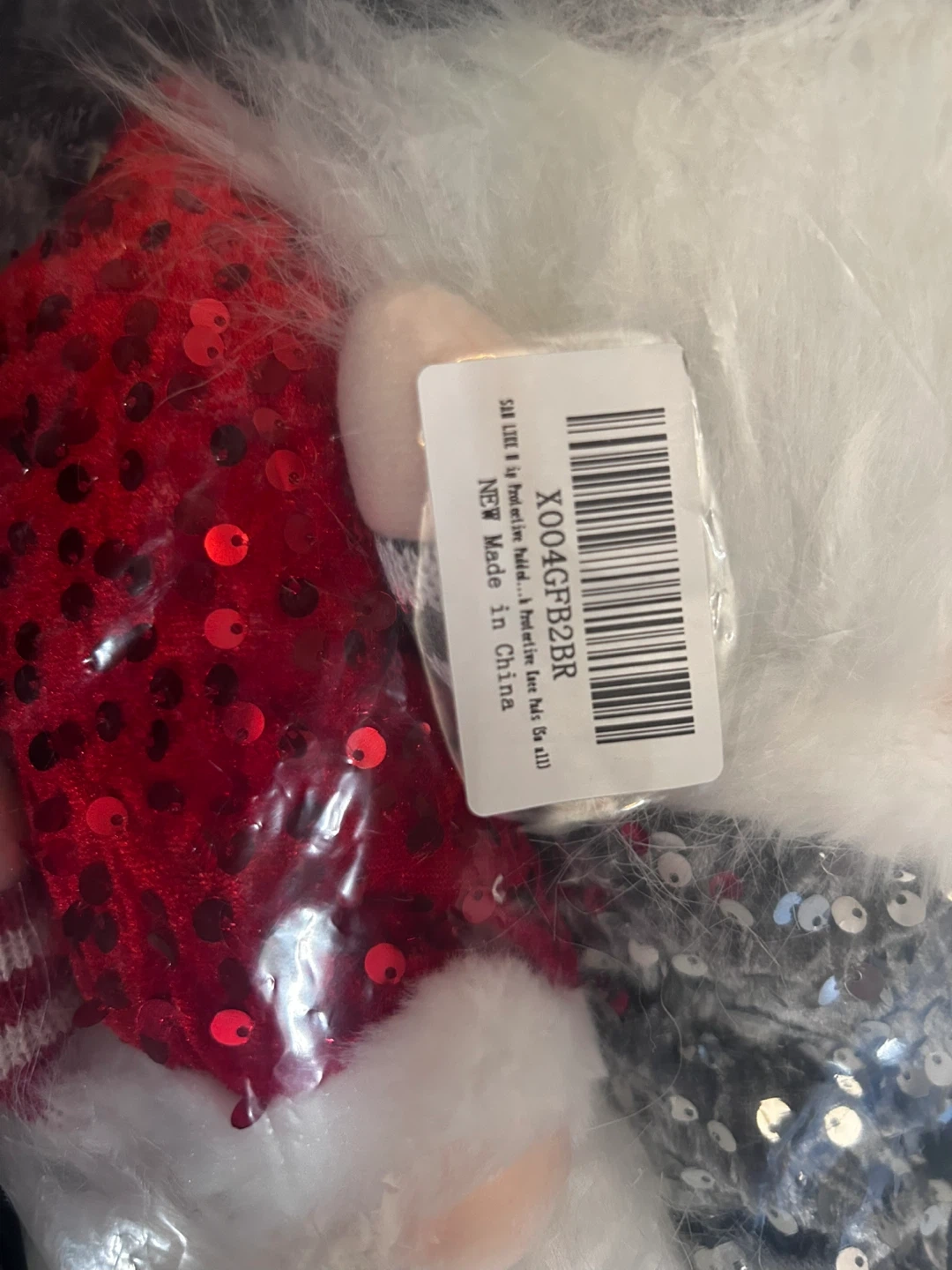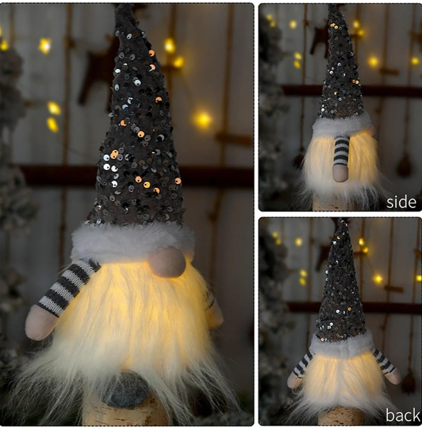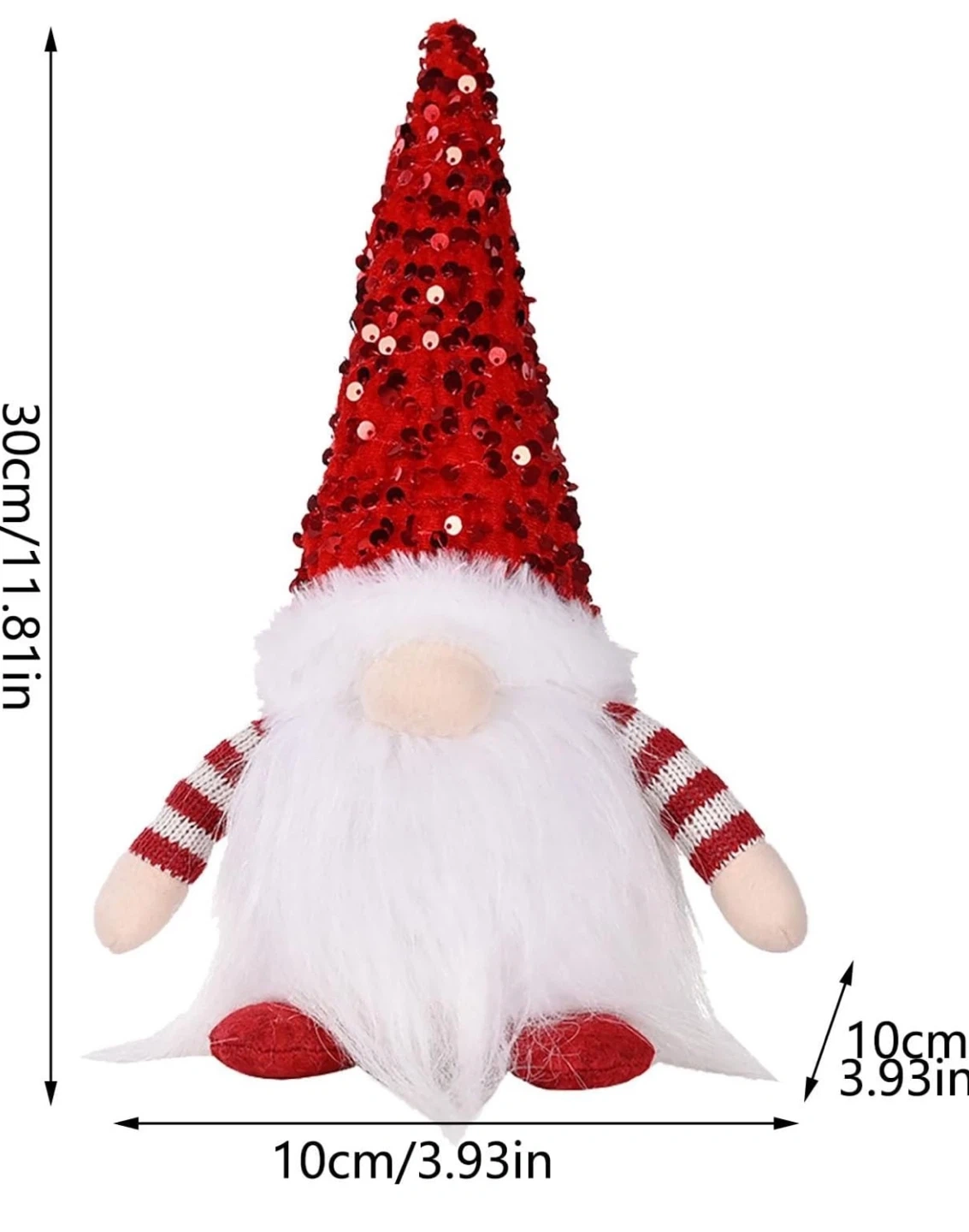 Two festive Christmas gnomes, one with a red sequined hat and the other with a grey sequined hat. They feature soft white beards and striped arm details. These cute decorations are ready to add some holiday cheer!