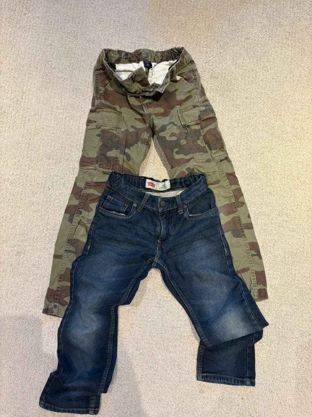 Bundle includes a pair of dark wash Levi's jeans and camouflage cargo pants. The jeans are size 8 Regular, and the cargo pants are size 8 regular Both are in good condition.