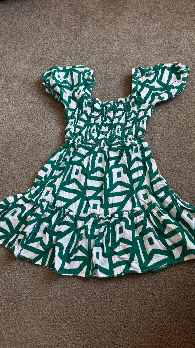 Selling a cute mini dress with a green and white geometric pattern. It features a smocked bodice and short puff sleeves. Perfect for summer!