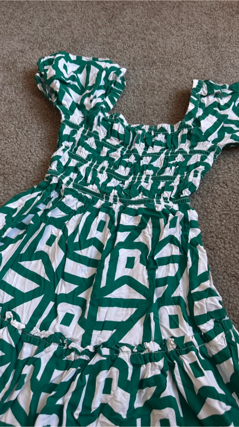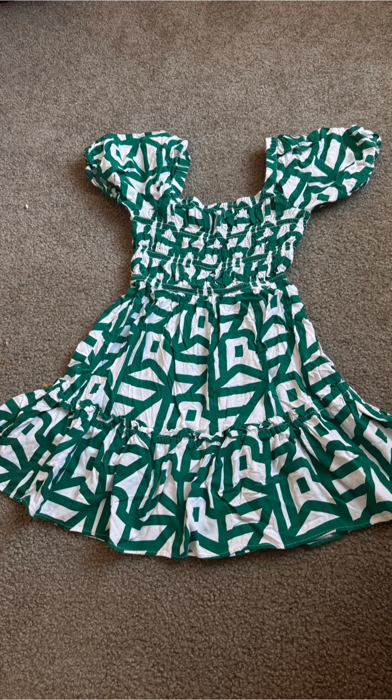 Selling a cute mini dress with a green and white geometric pattern. It features a smocked bodice and short puff sleeves. Perfect for summer!