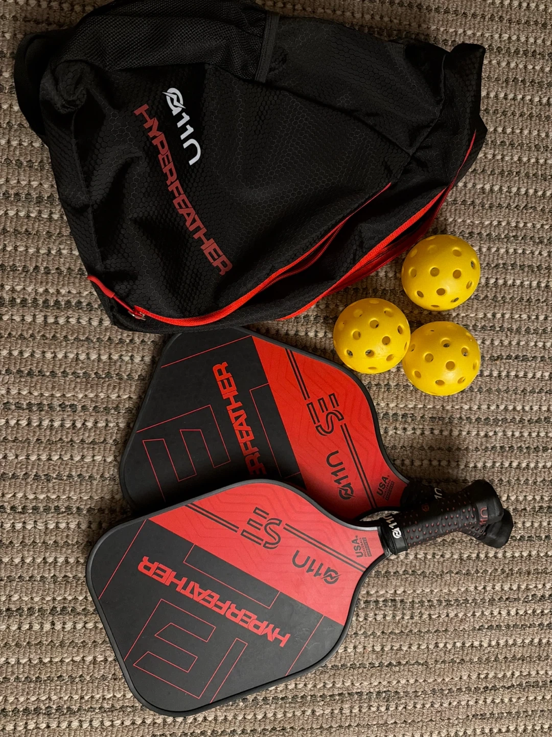 This set includes two 110 Hyperfeather pickleball paddles, three yellow pickleball balls, and a black carrying bag. All in excellent condition.