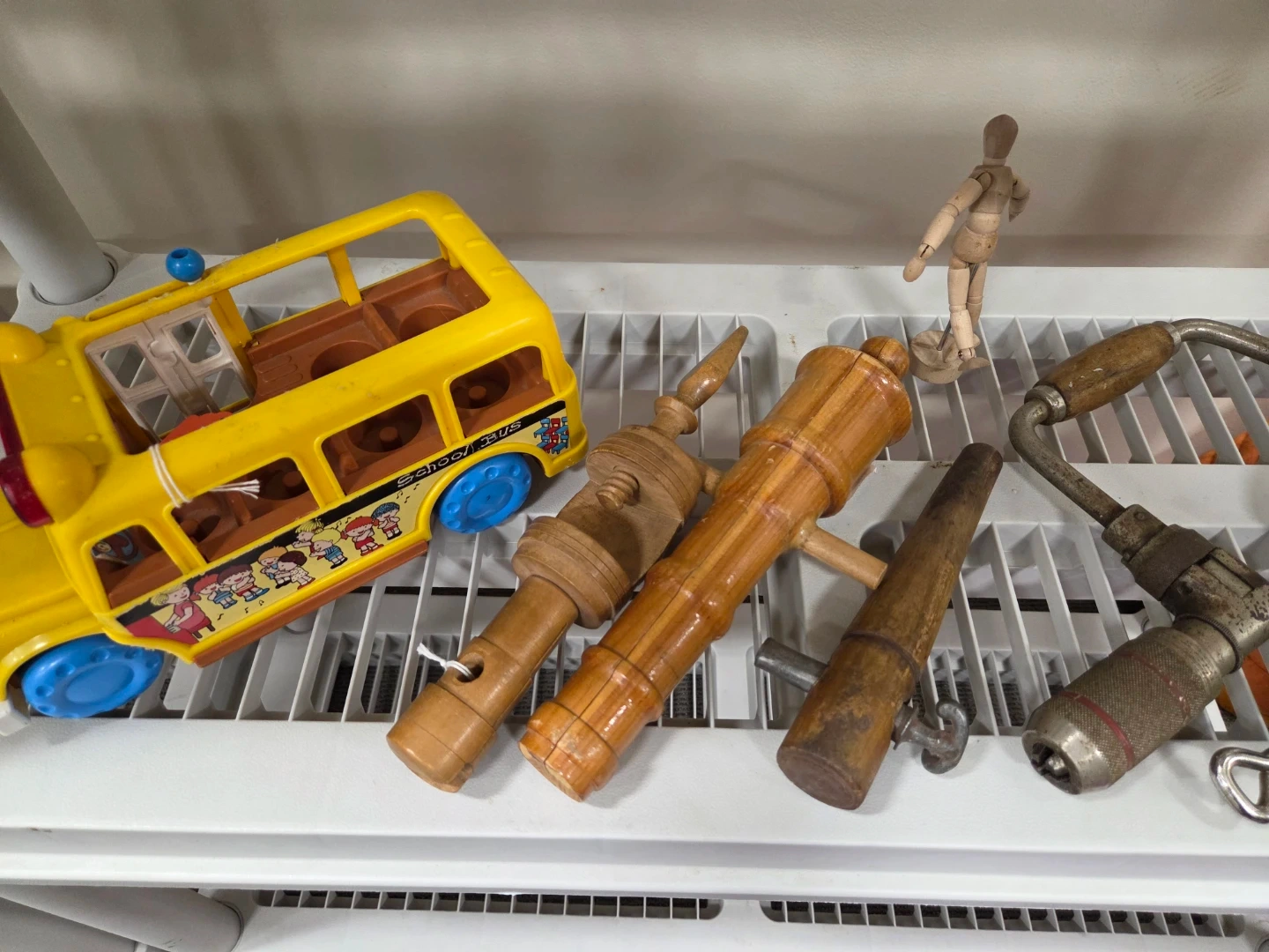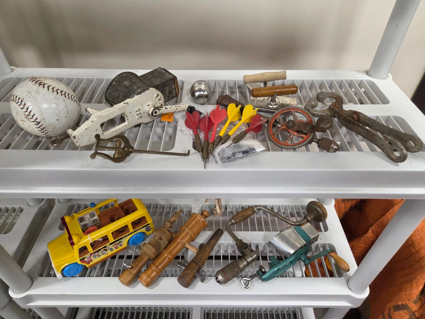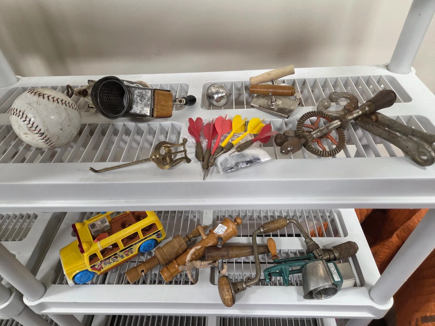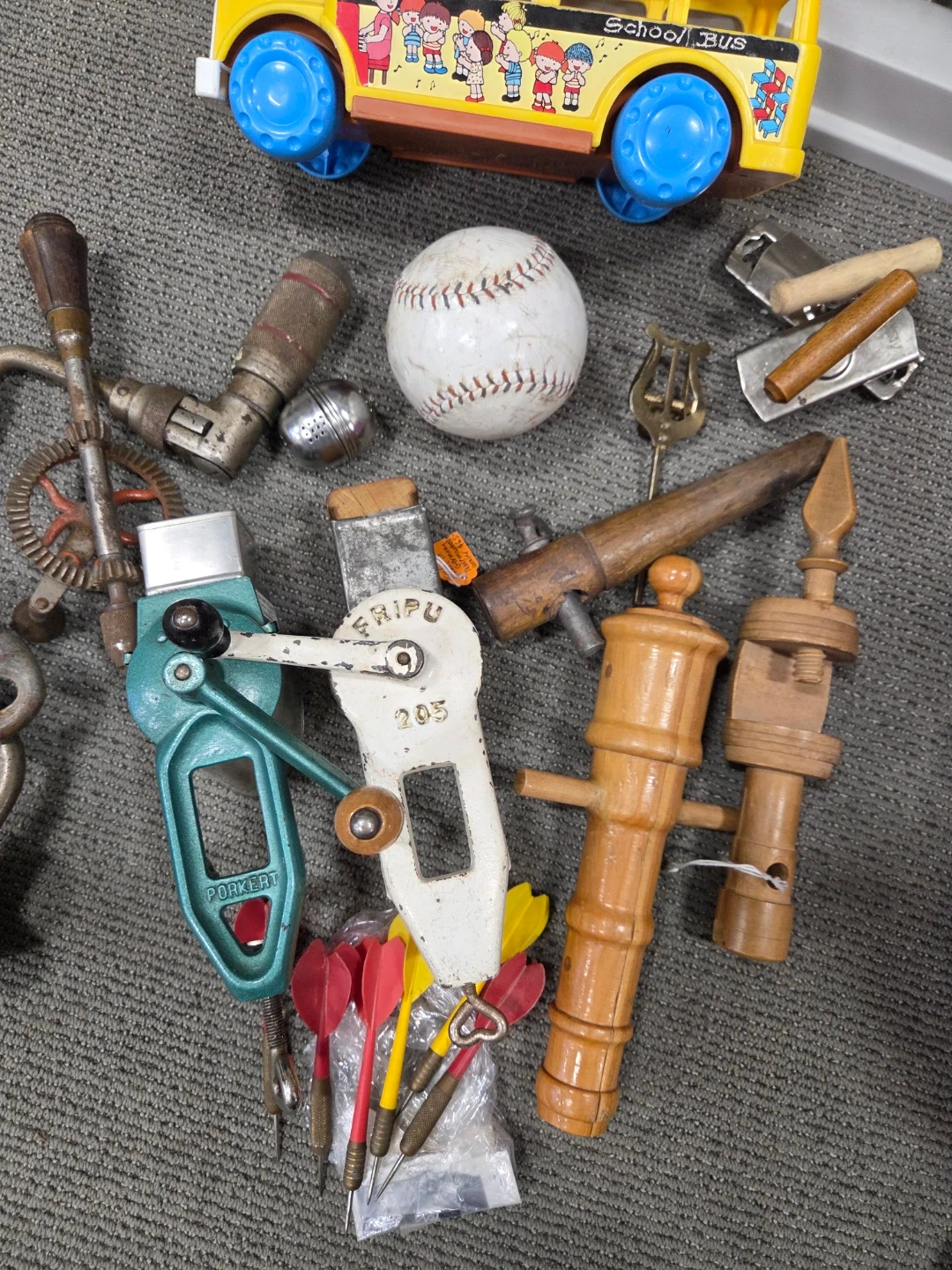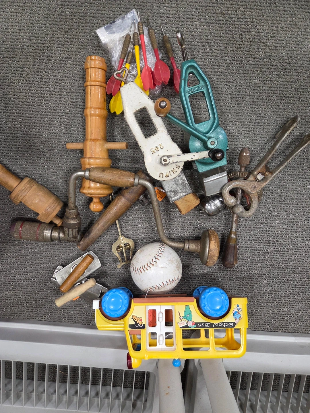 Vintage kitchen items and tools. You get all the gadgets in the photo. Including drills and meat grinders. Vintage darts, spigot for wine / wiskey barell, yellow toy bus, old baseball, part of a yarn spinning wheel, jar openers, a music sheet holder for an unknown instrument and more.