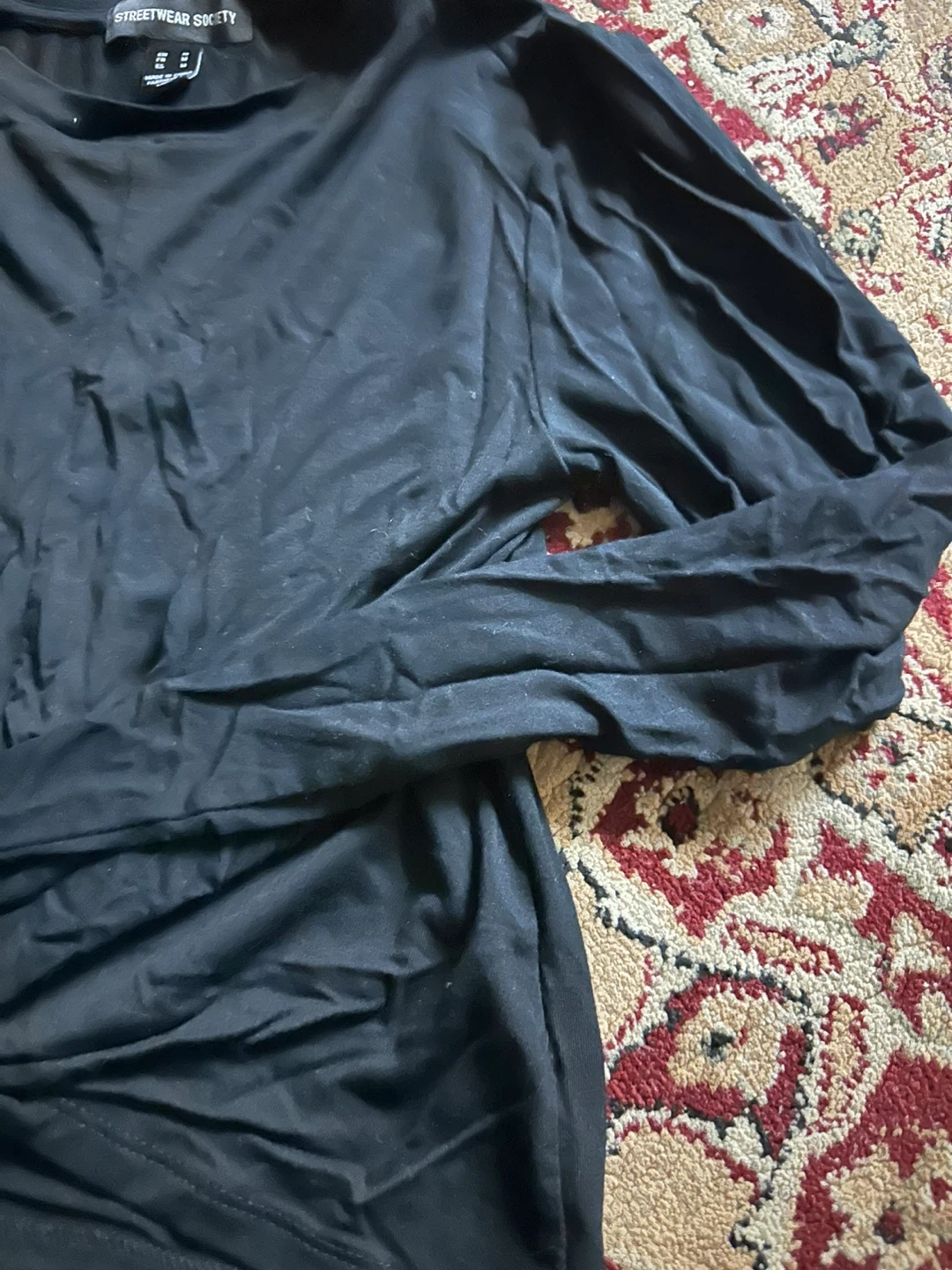 This is a black long-sleeve top from Streetwear Society. It features a stylish twist-front detail. The material is soft and comfortable. Size medium.