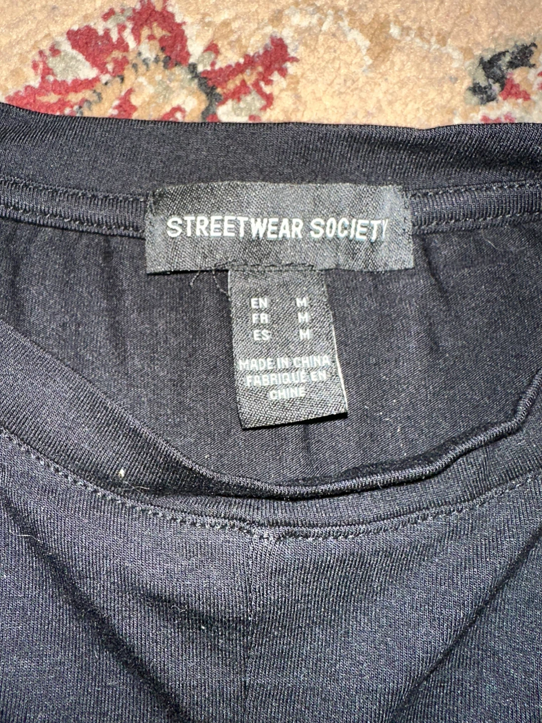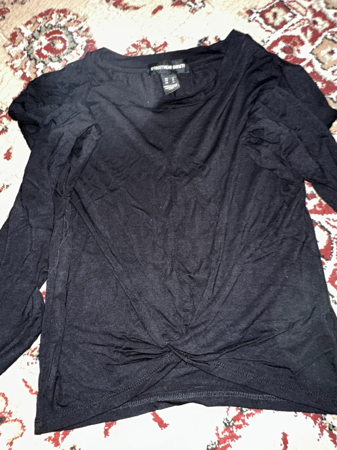 This is a black long-sleeve top from Streetwear Society. It features a stylish twist-front detail. The material is soft and comfortable. Size medium.