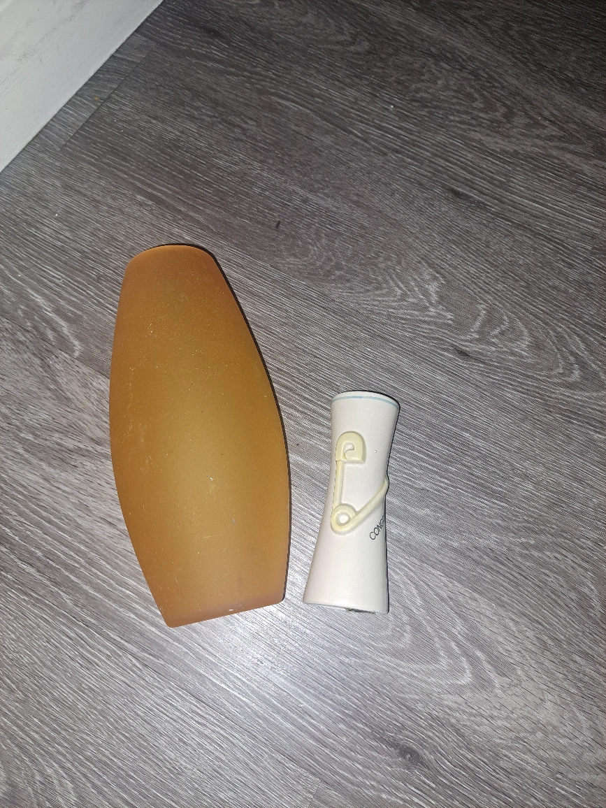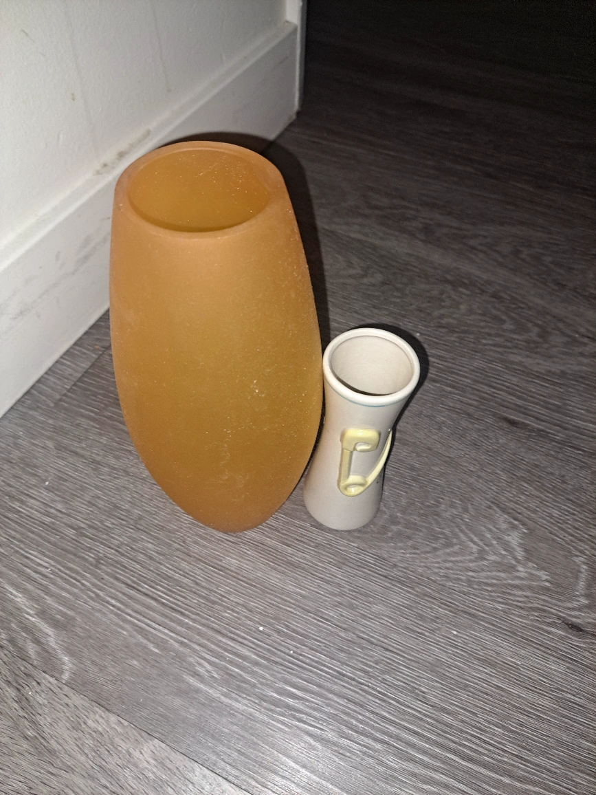 Two vases for sale. One is a larger vase with a matte, amber finish, and the other is a smaller, white vase with a decorative accent. They're both in good condition and would make a nice addition to any home