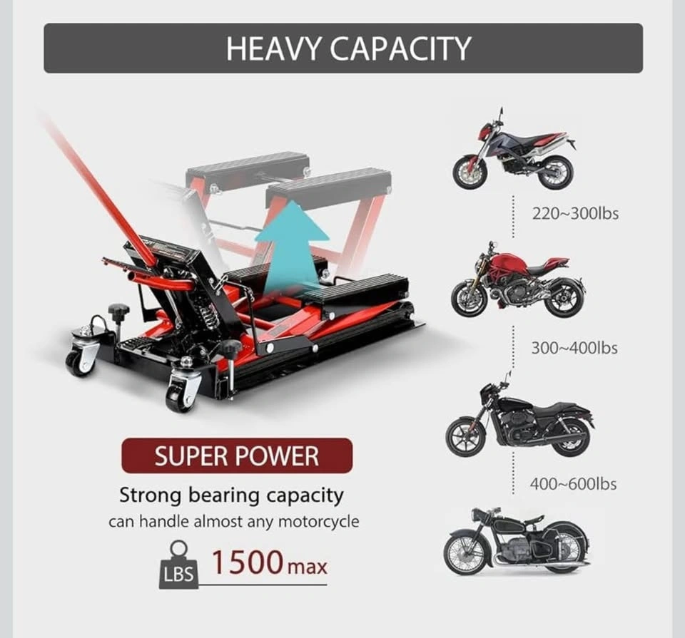 Gato elevador hidráulico para motocicleta, capacidad de 1500 libras, gato elevador de tijera, portátil, con 4 ruedas, soporte hidráulico de elevación de pie para motocicleta