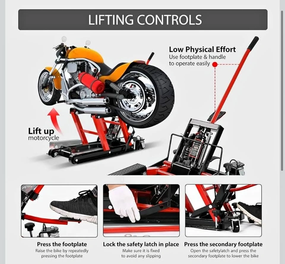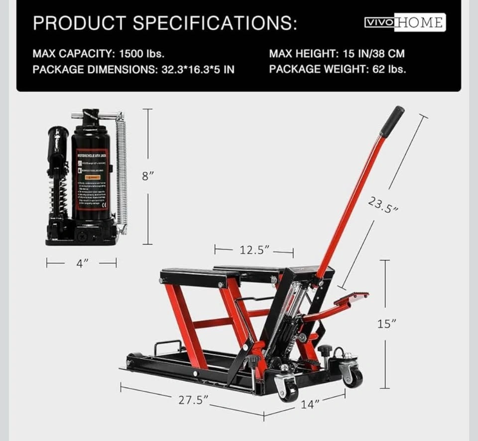 Hydraulic lift jack for motorcycle, 1500 pounds capacity, scissor lift jack, portable, with 4 wheels, hydraulic stand lift for motorcycle