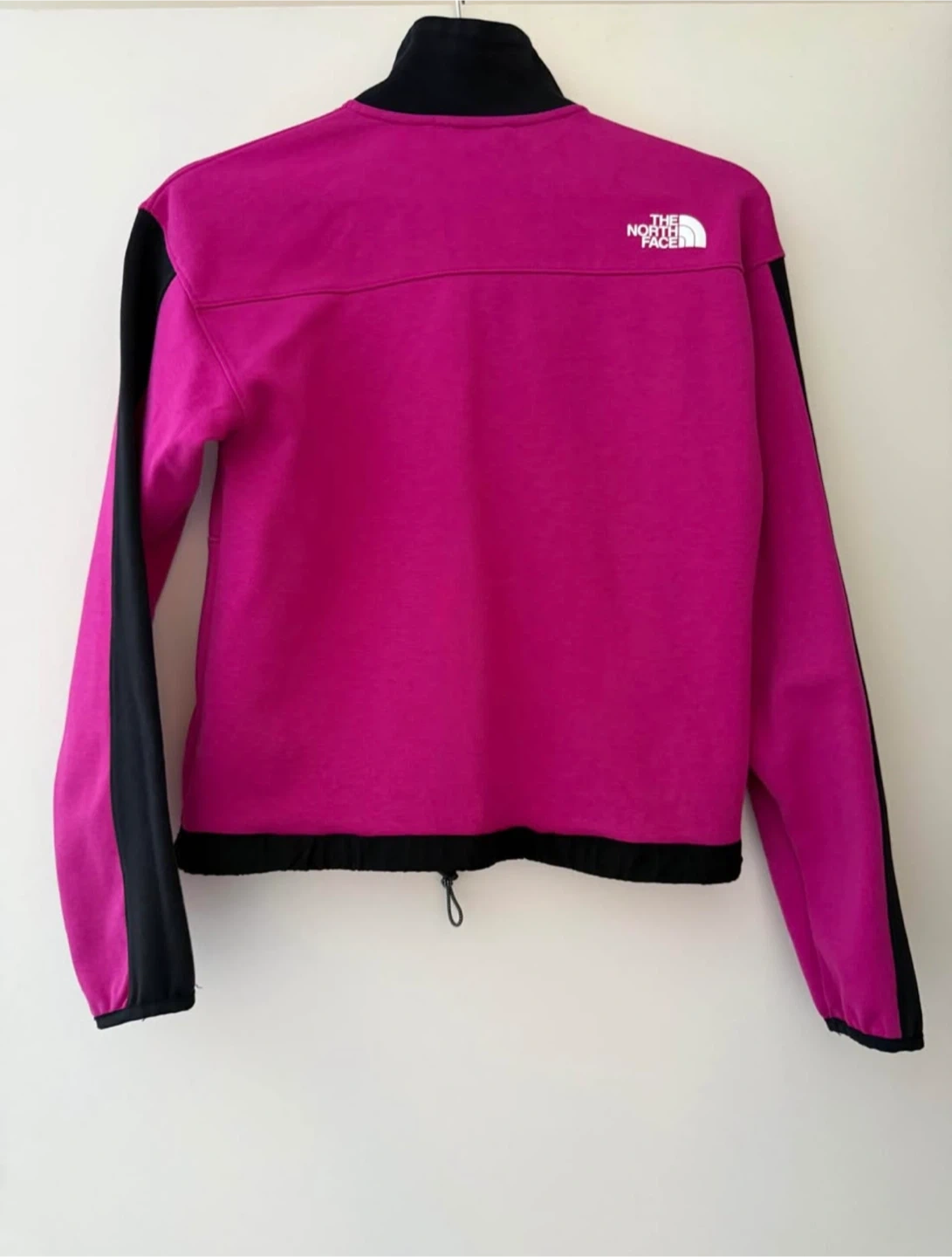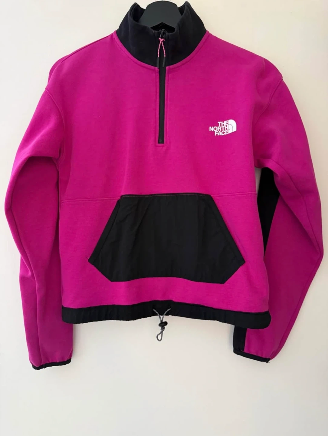 This is a women's fleece quarter-zip jacket from The North Face. It's bright pink with black accents and sleeves. It features a kangaroo pocket on the front. This jacket is great for staying warm during outdoor activities.