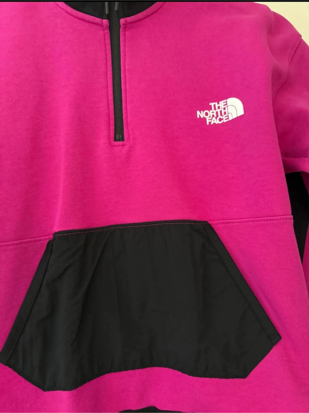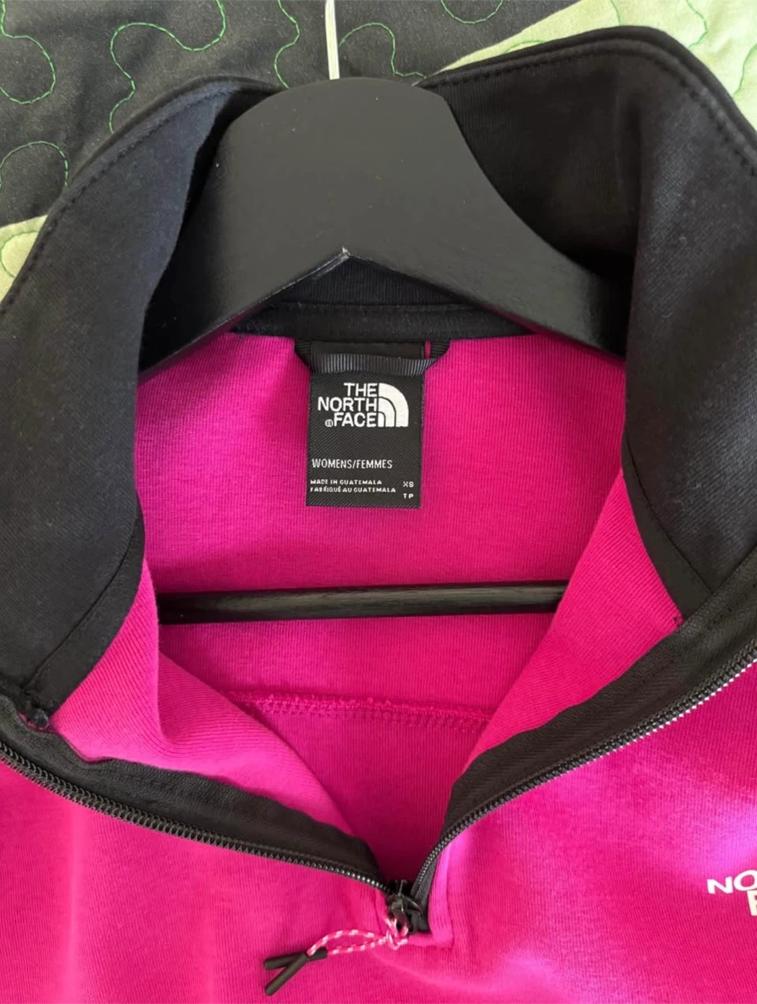 This is a women's fleece quarter-zip jacket from The North Face. It's bright pink with black accents and sleeves. It features a kangaroo pocket on the front. This jacket is great for staying warm during outdoor activities.