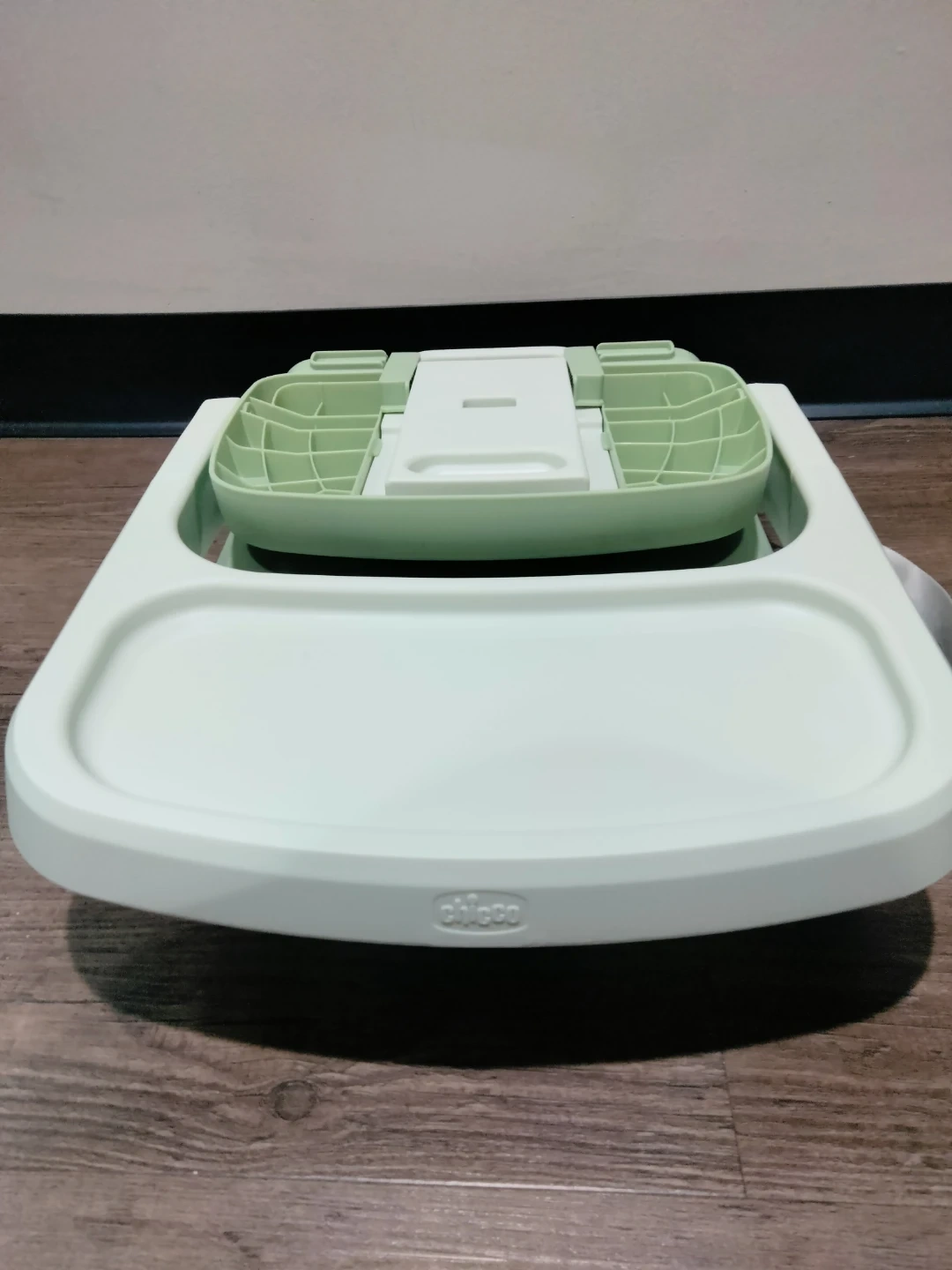 The removable tray is BPA-free and easy to clean. Plus, it folds up compactly with a built-in carry handle for grab-and-go convenience! Recommended age range is for babies and toddlers who can sit up unaided.