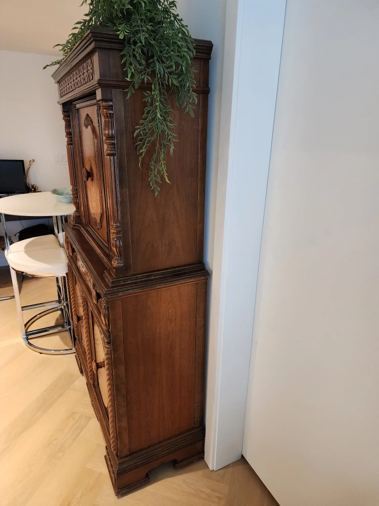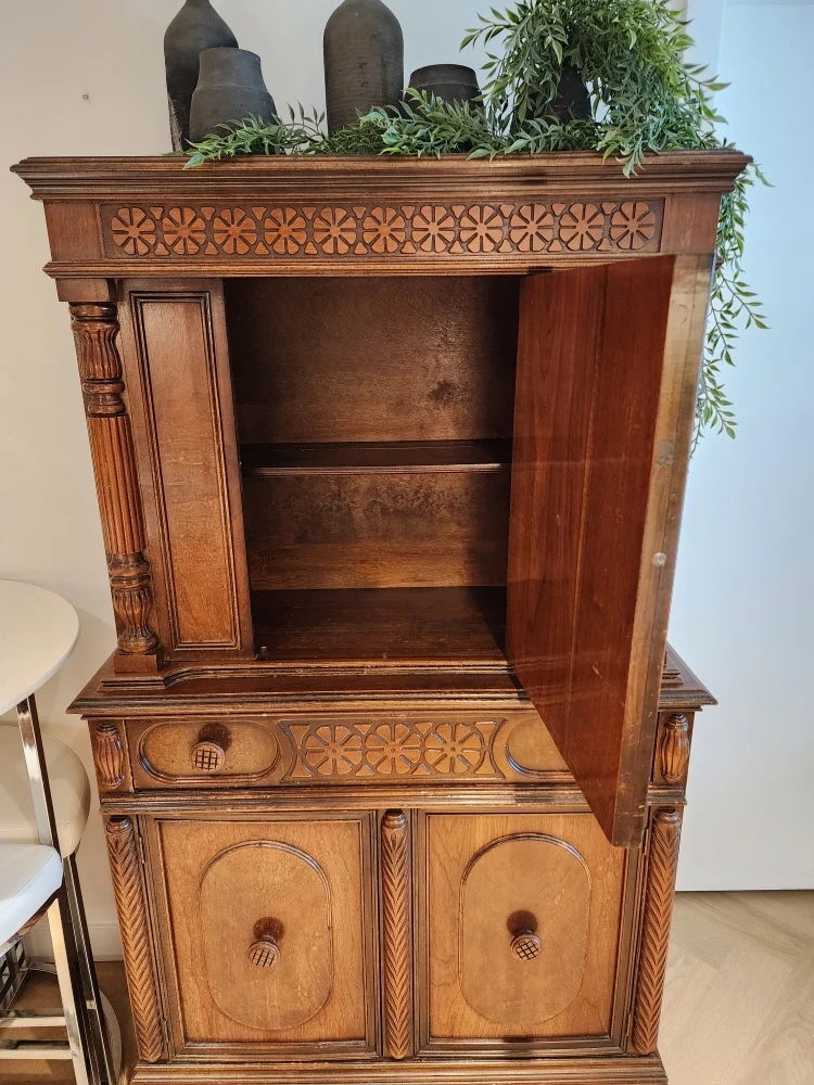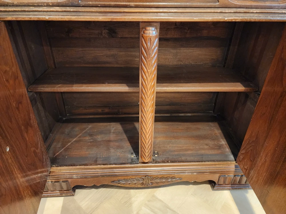 This beautiful china cabinet is crafted from dark wood and features decorative carvings. It has two lower doors, one drawer, and an upper section with shelves behind cabinet doors. A lovely piece for any dining or living space!