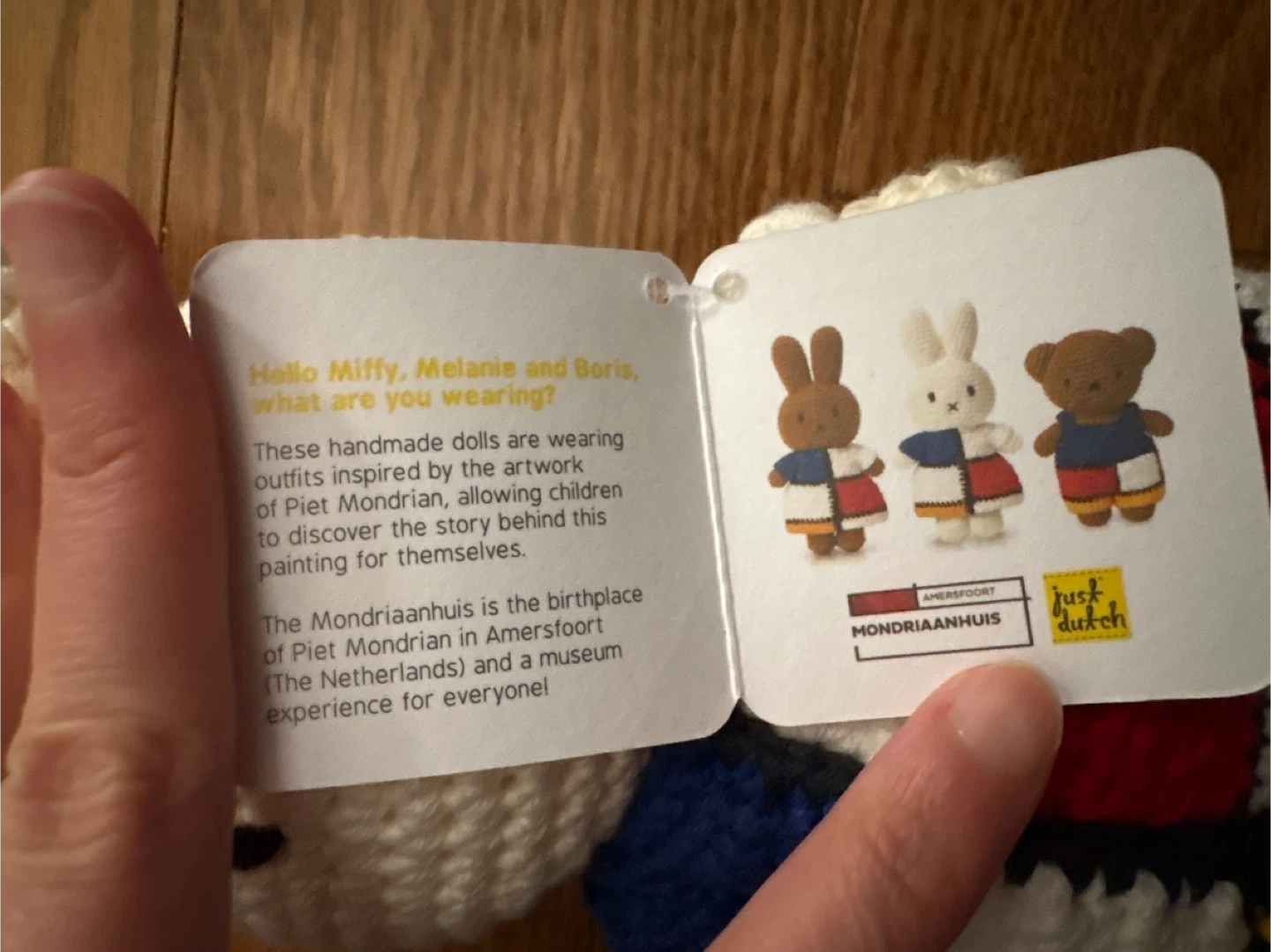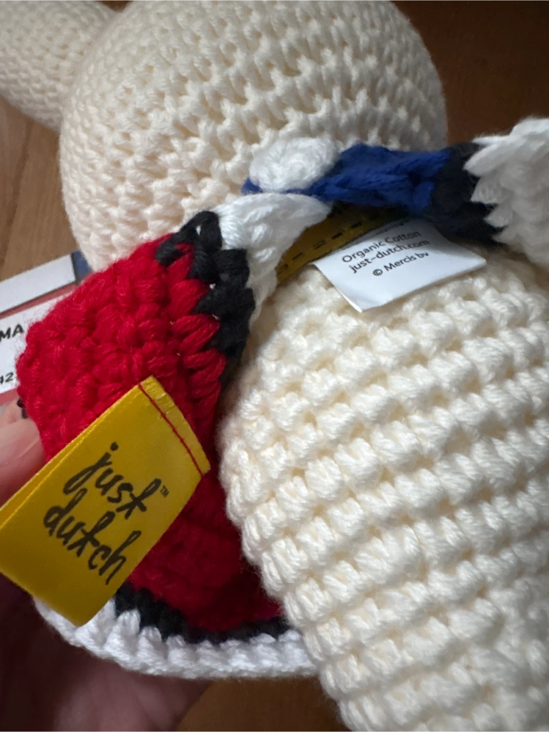 This is a handmade Miffy crochet doll by Just Dutch. It's wearing an outfit inspired by Piet Mondrian's artwork. Made from organic cotton. Great for collectors or as a unique decor piece!