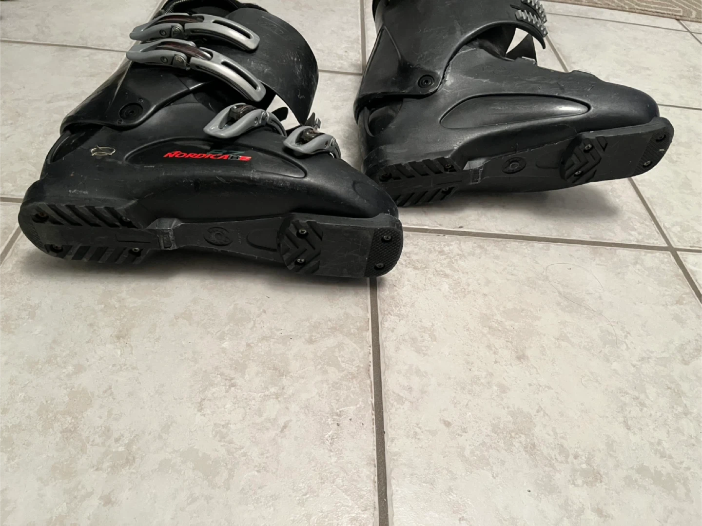 These are a pair of black Nordica B7 men's ski boots. They have a soft flex for all-mountain skiing. The boots feature multiple buckles for a secure fit. 320mm size