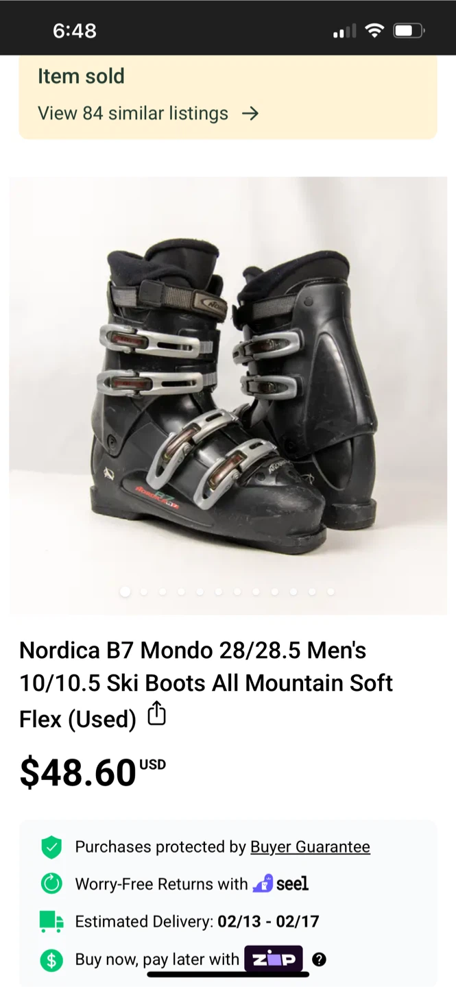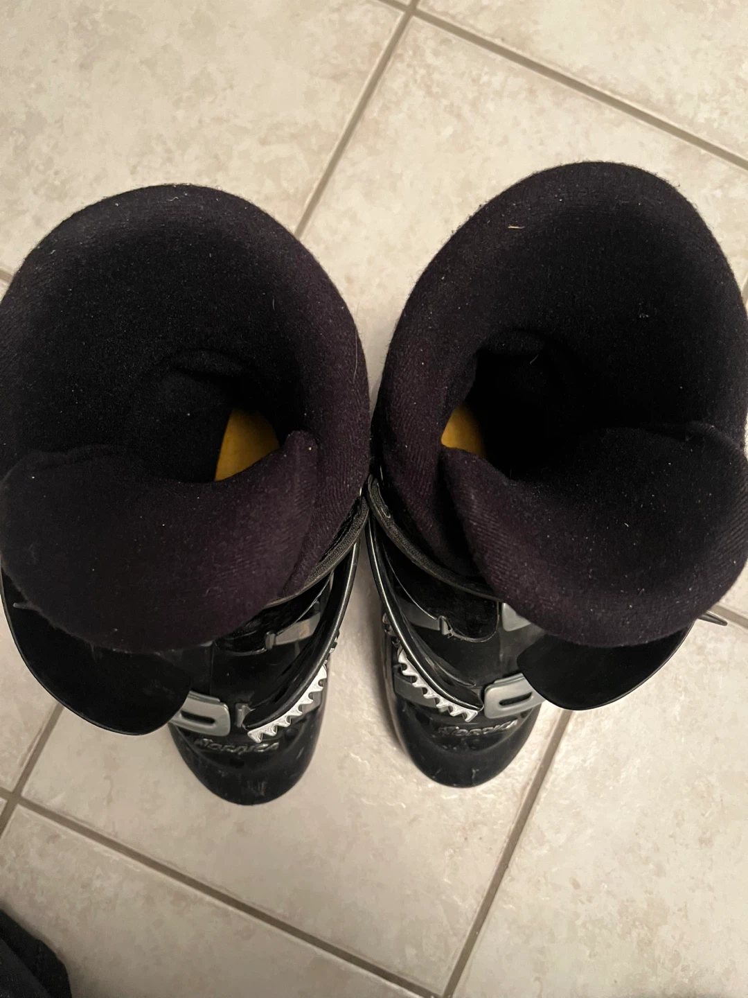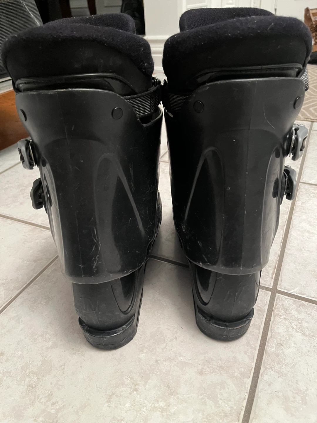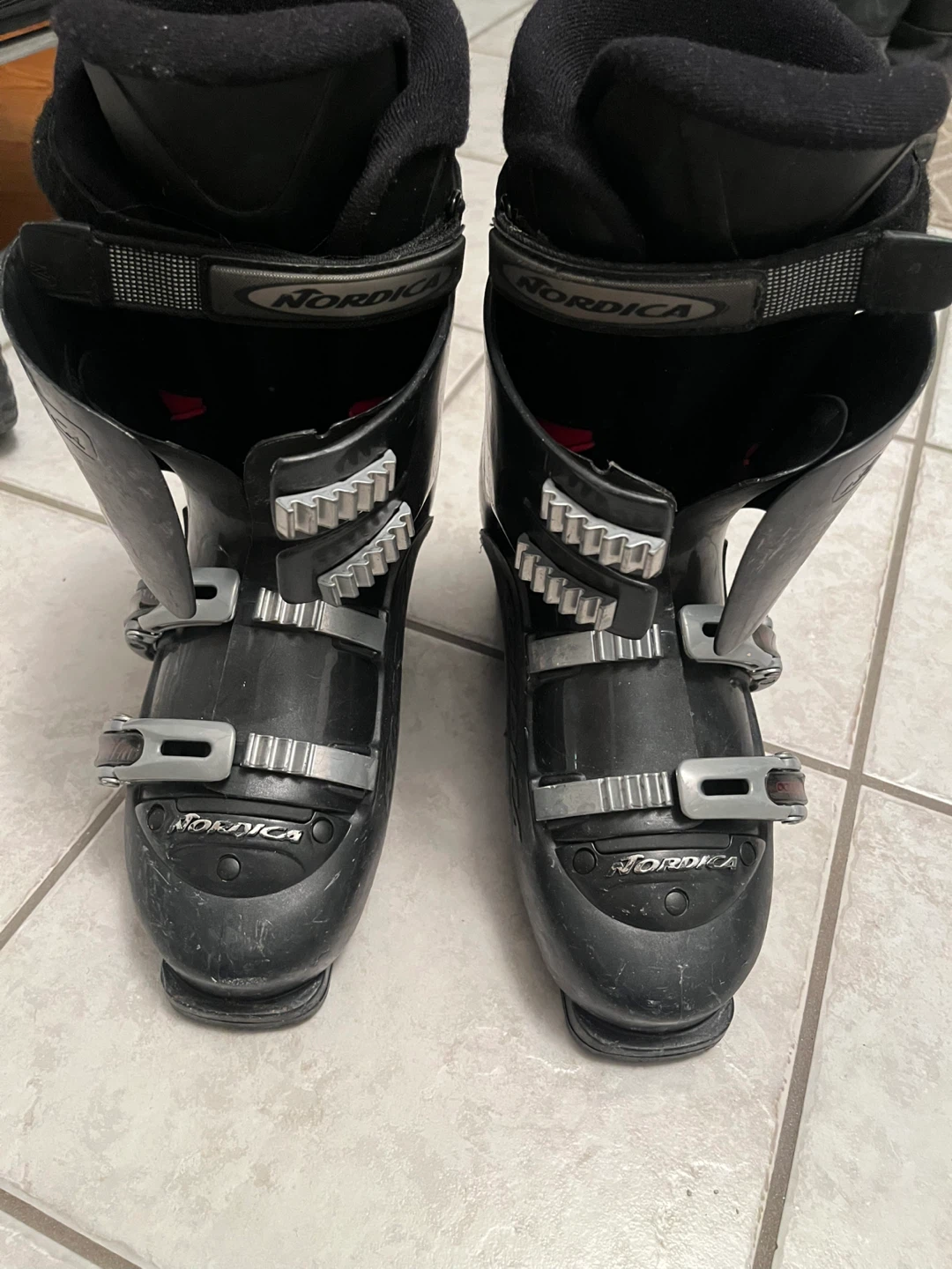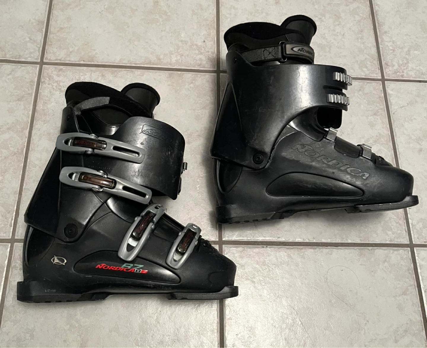 These are a pair of black Nordica B7 men's ski boots. They have a soft flex for all-mountain skiing. The boots feature multiple buckles for a secure fit. 320mm size