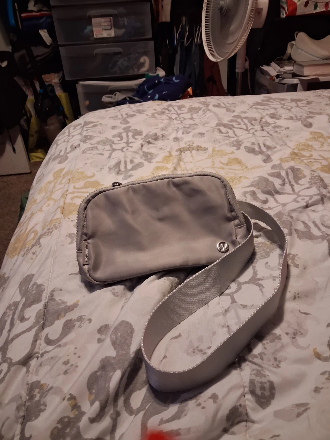 Lululemon Everywhere belt bag in a light grey color. Features a zippered compartment and an adjustable strap. It's made of a durable, water-resistant material.