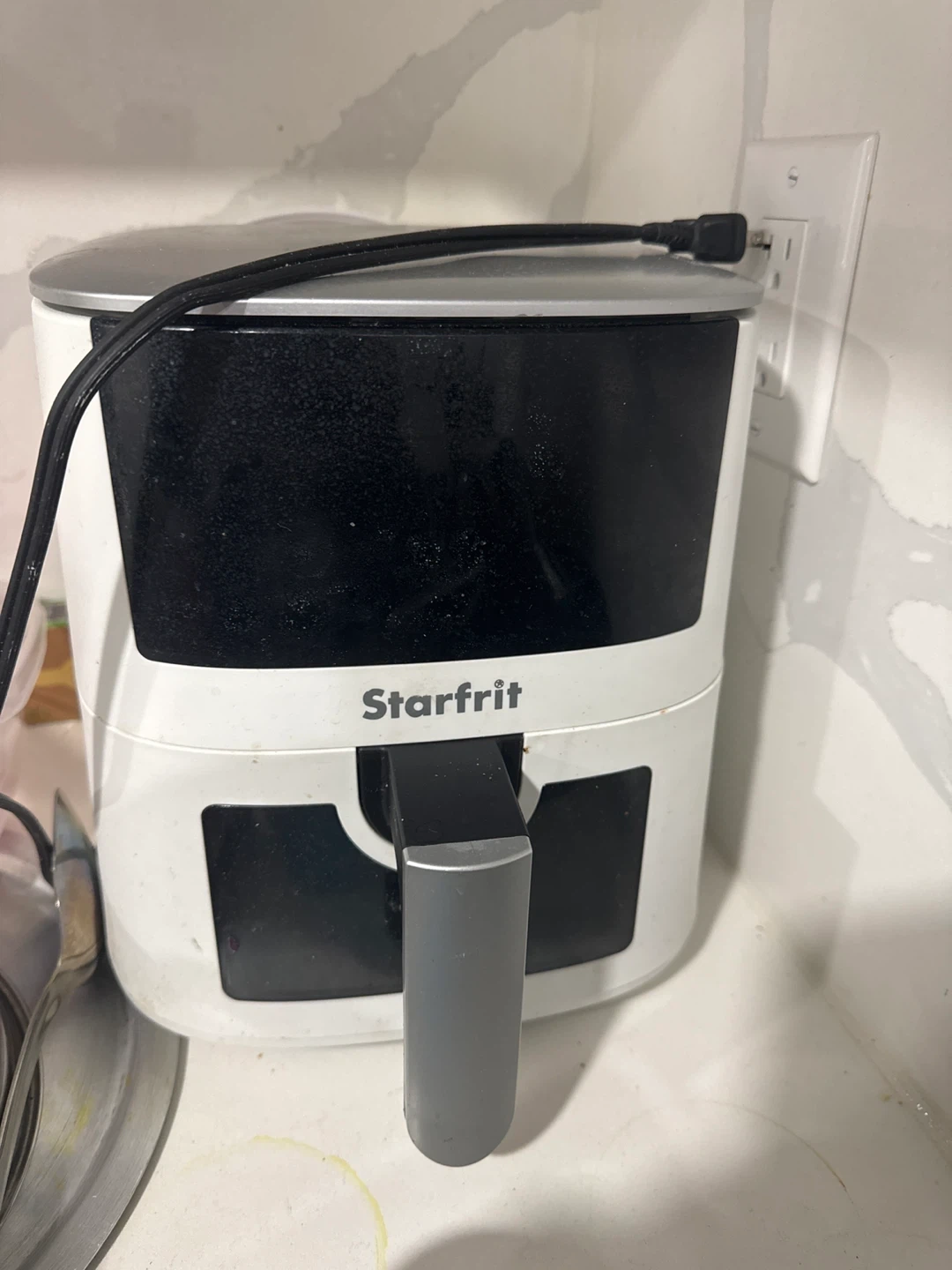 White and black Starfrit air fryer. It's compact and easy to use for quick meals. Perfect for fries, chicken, and veggies!