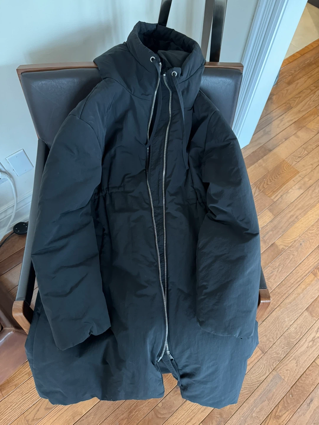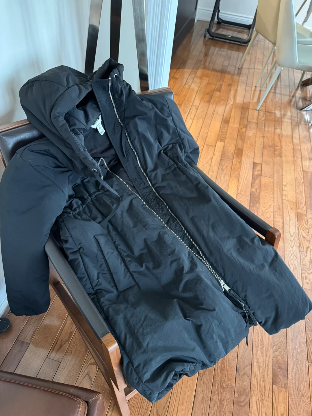 Selling a gently used H&M Mama maternity puffer coat in black. It's a size small and perfect for staying warm during those colder months. The coat features a hood and a zipper closure. Great for expecting mothers!