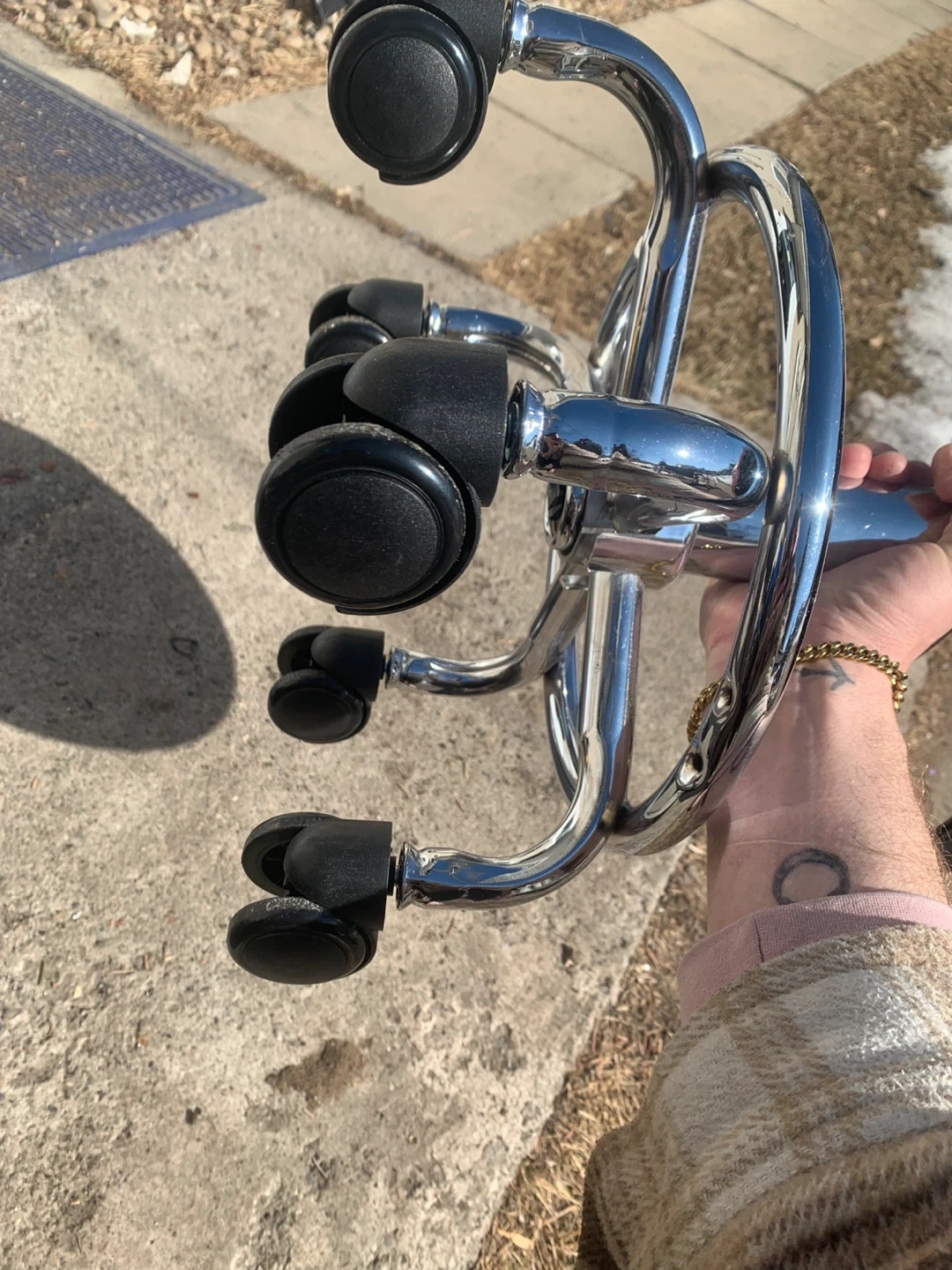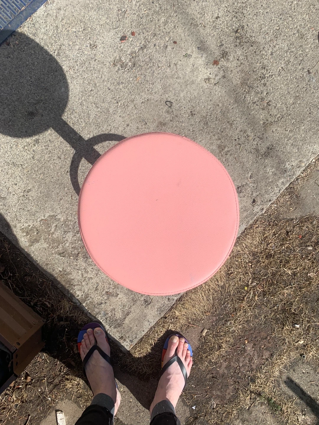 This is a pink, adjustable rolling stool. It features a chrome base with five wheels for easy mobility. The seat is padded and covered in a durable material.
