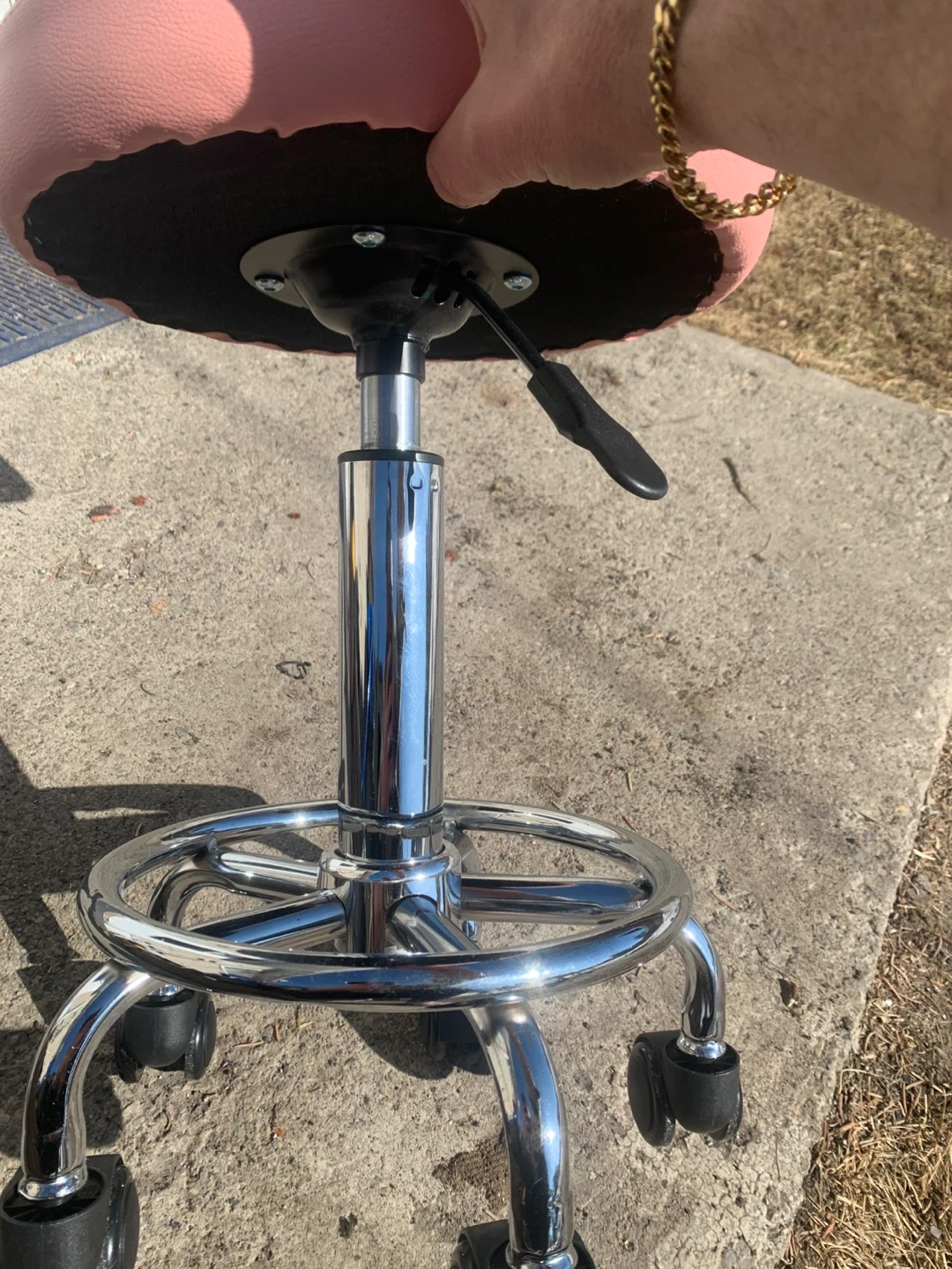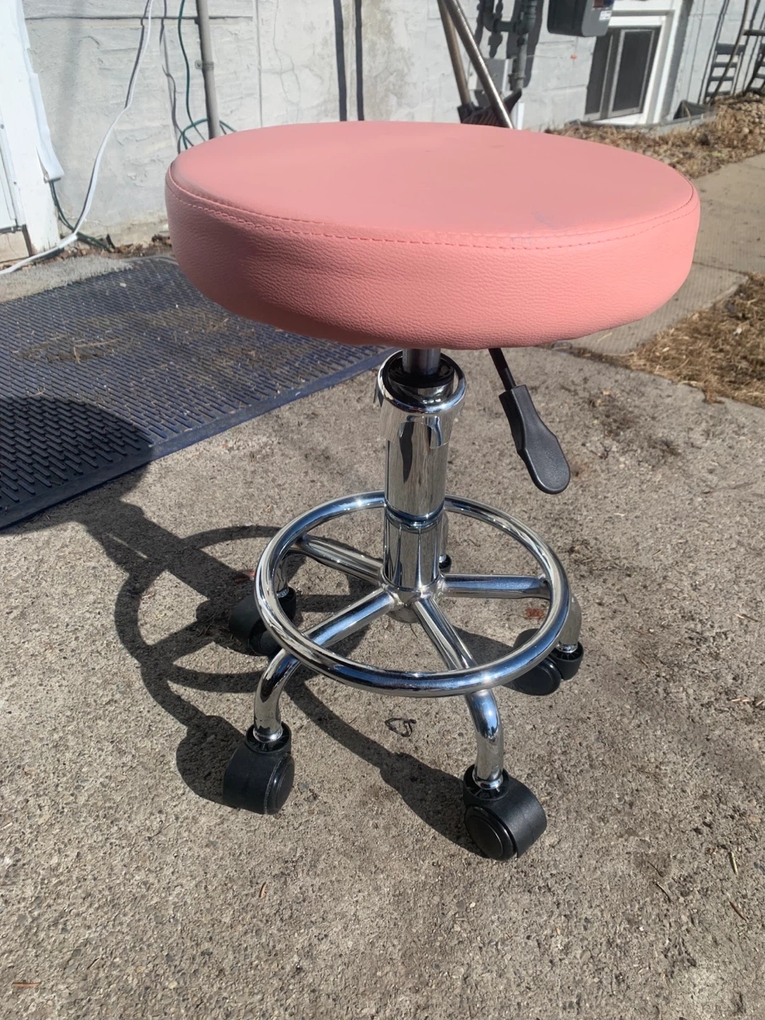 This is a pink, adjustable rolling stool. It features a chrome base with five wheels for easy mobility. The seat is padded and covered in a durable material.