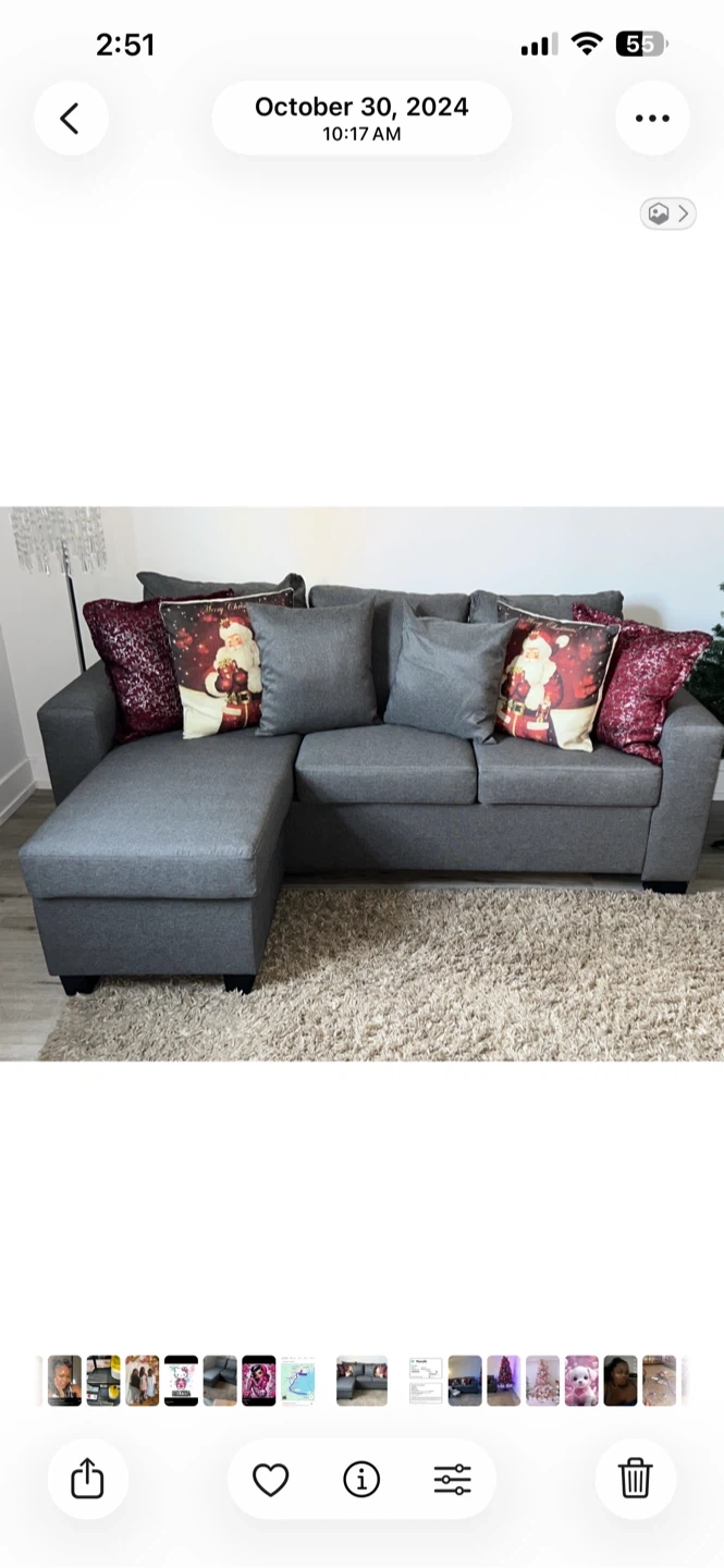 Grey fabric sectional sofa with a chaise attachment. It's comfy and has storage underneath the chaise seat! Comes with accent pillows. Excellent condition