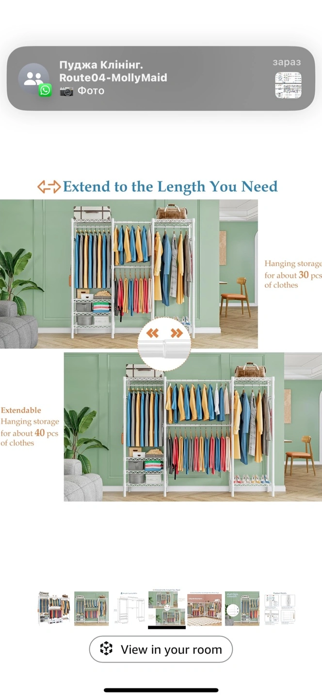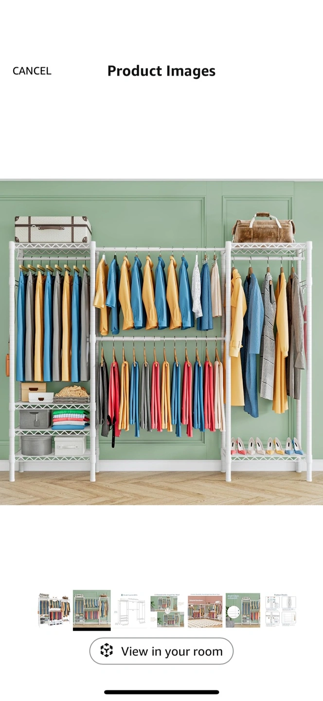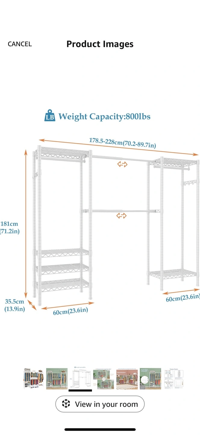 Expandable clothing rack. Features adjustable shelves and hanging rods. Durable metal construction. Great for closets or storage rooms. Holds up to 800 lbs.