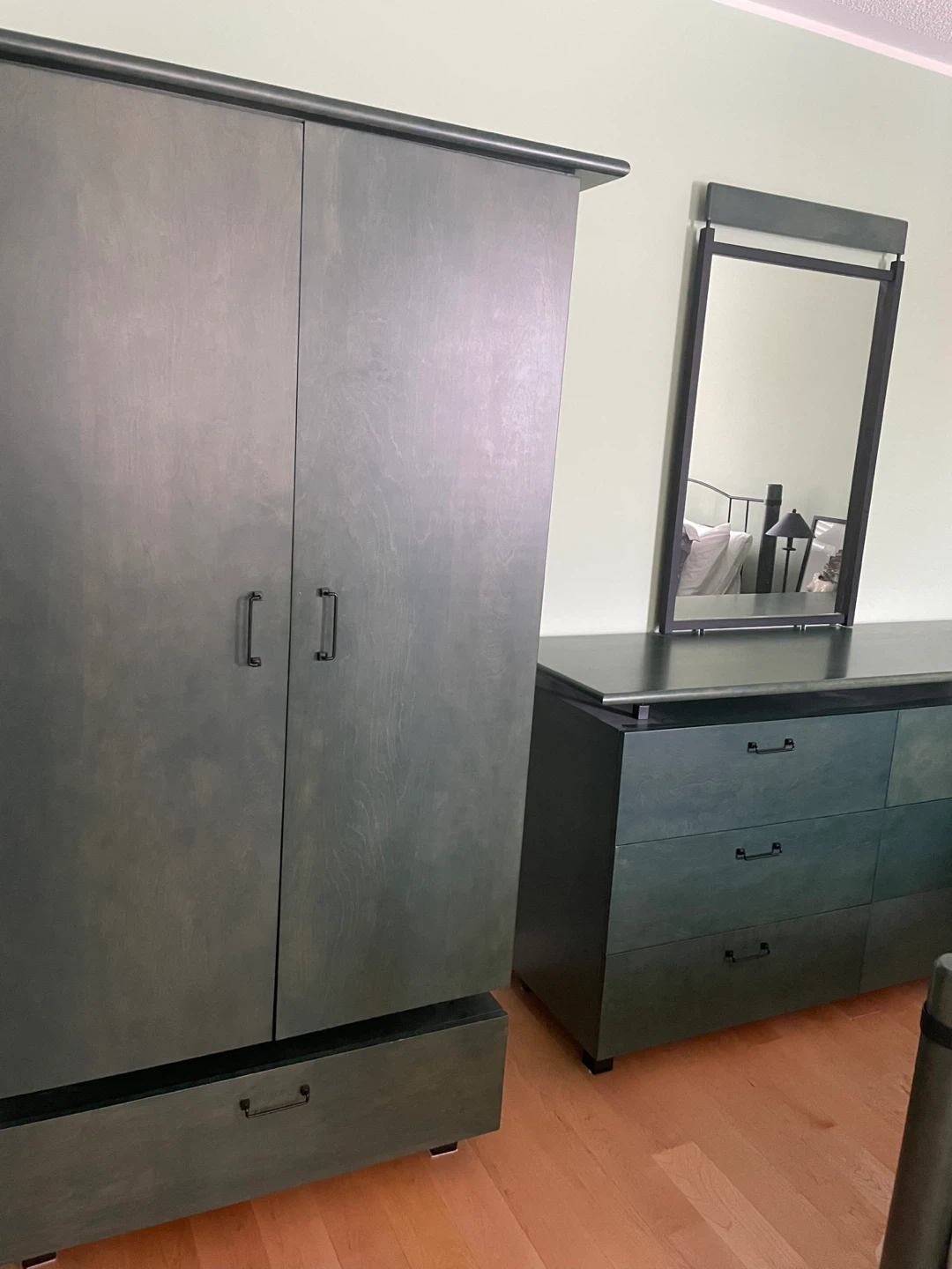 Selling a wardrobe and dresser with a mirror. It's a matching set in a dark grey/green colour. Great for adding storage and style to any bedroom!