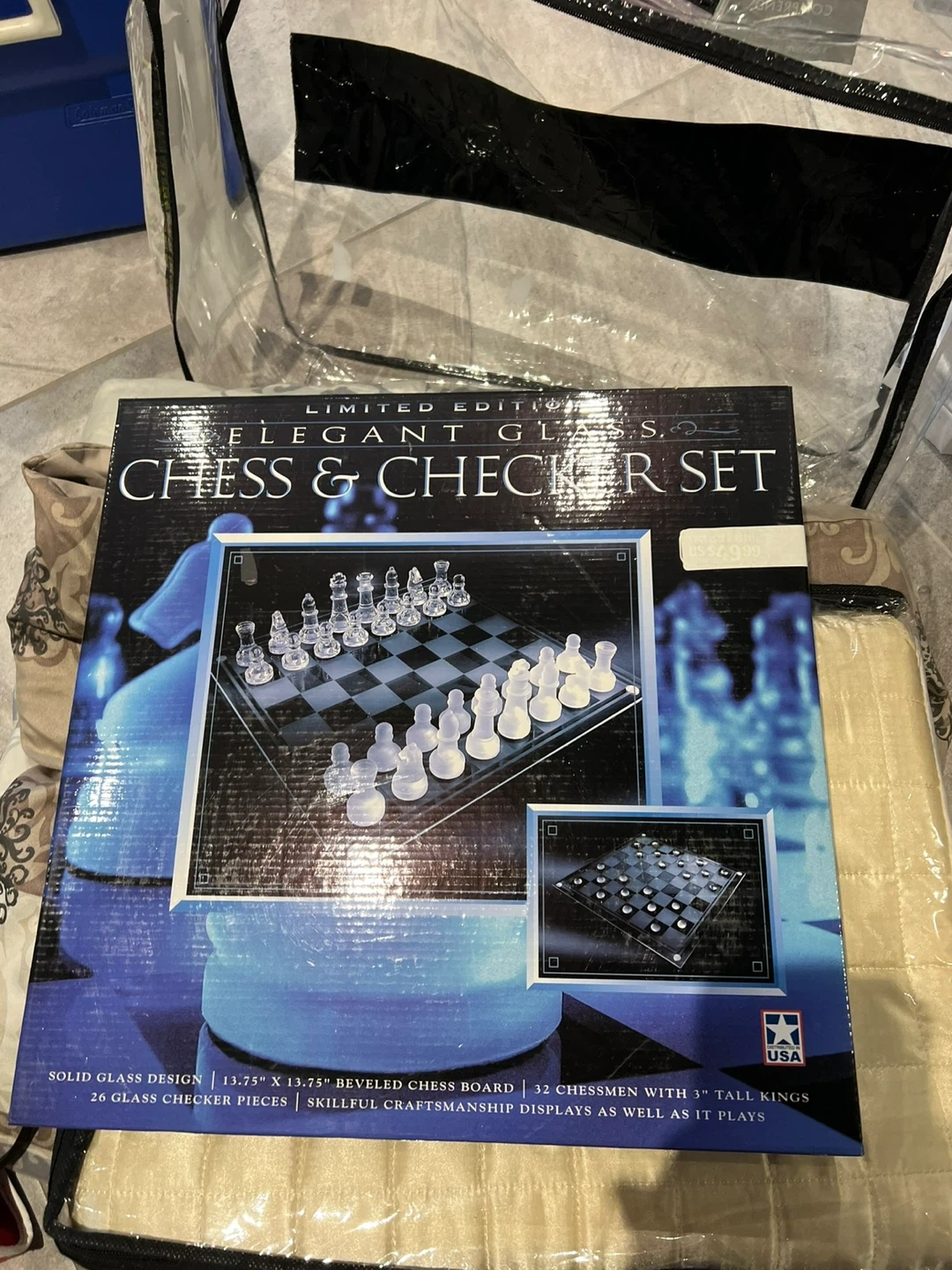 Solid glass design chess and checker set. Includes a 13.75" x 13.75" beveled chess board and 32 glass chessmen with 3" tall kings. Also comes with 26 glass checker pieces. Skillful craftsmanship displays as well as it plays!
