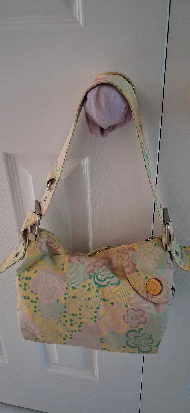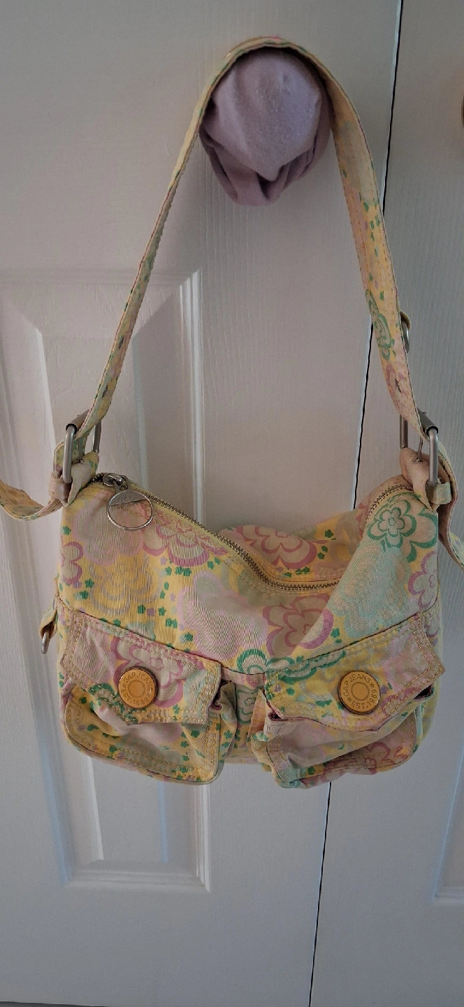 Cute GAP Jeans shoulder bag with a fun floral pattern! It has a zipper closure and some small pockets on the front. Perfect for adding a touch of retro style to your outfit