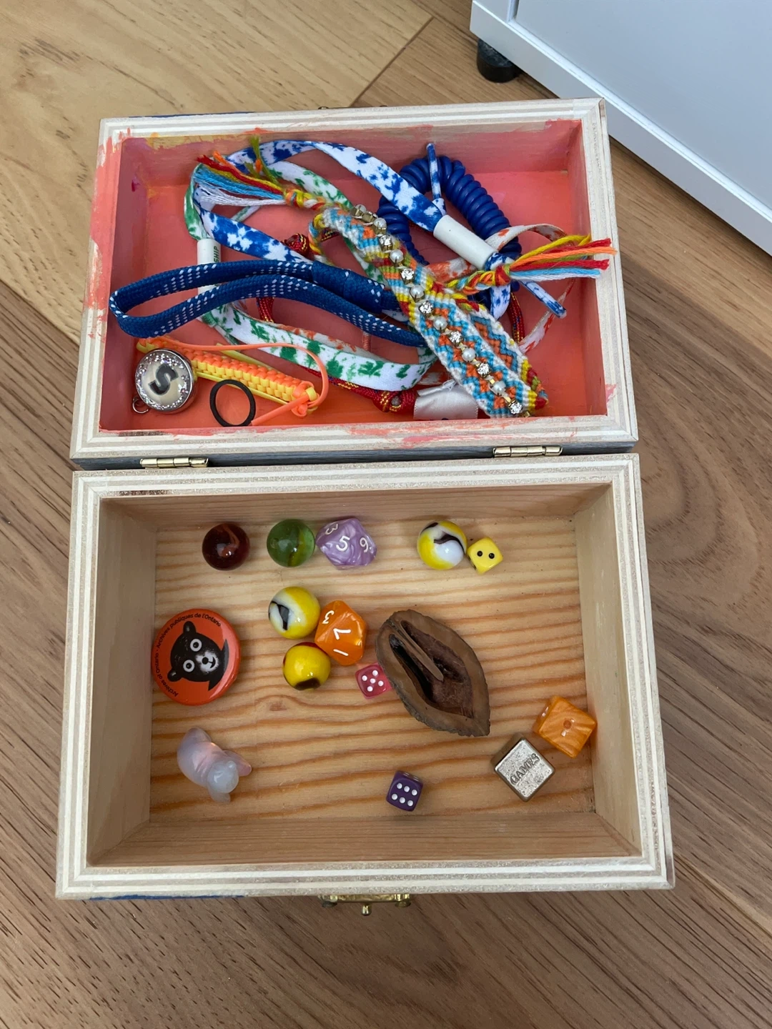 This wooden box is filled with a variety of fun items. It includes colourful friendship bracelets, glass marbles, and dice. There's also a small pin featuring a bear and French text, along with a dried seed pod and other trinkets. It's a charming collection for anyone who enjoys small treasures!