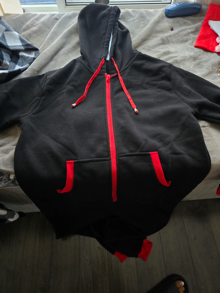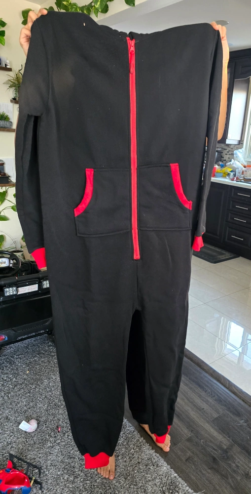 Black onesie with red trim. Long sleeves, zipper closure, and a hood. Two pockets on the front. Brand new