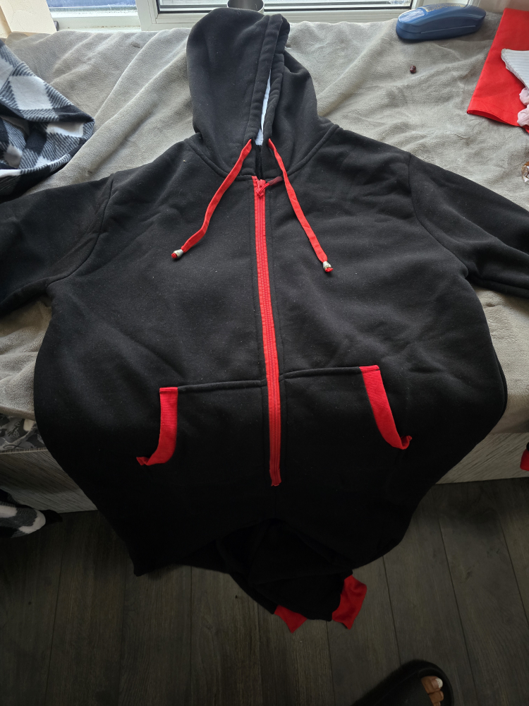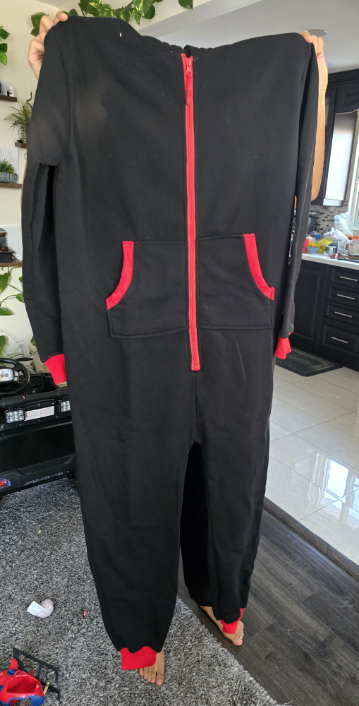 Black onesie with red trim. Long sleeves, zipper closure, and a hood. Two pockets on the front. Brand new